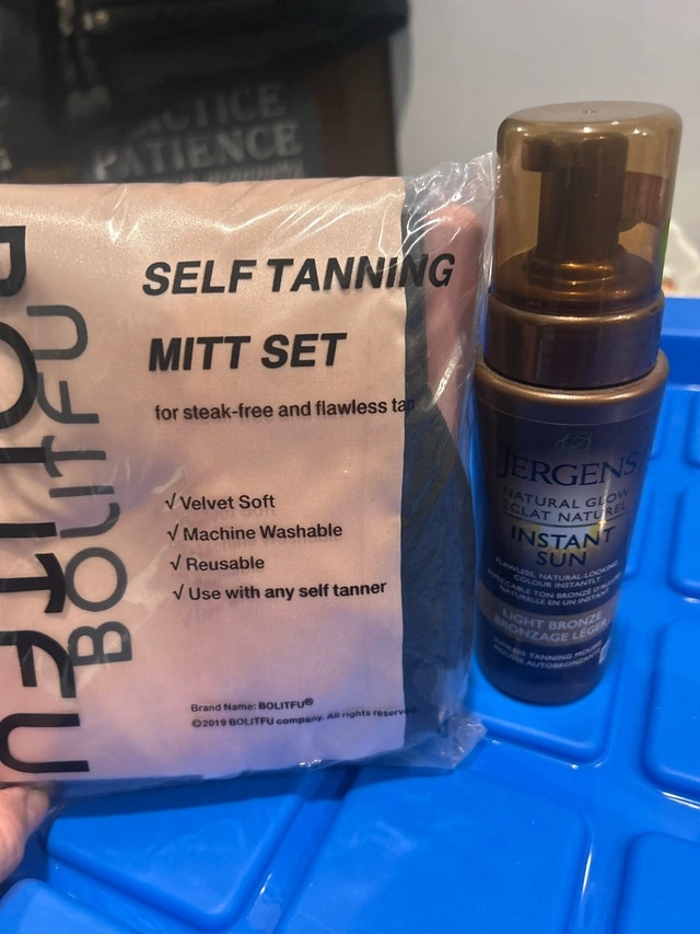 Achieve a flawless, natural-looking tan with this Bolitfu Self Tanning Mitt Set and Jergens Natural Glow Instant Sun Mousse in light bronze. The set includes a velvet-soft, machine washable, and reusable mitt for streak-free application with any self tanning. They're in great condition, ready to help you achieve that sun-kissed glow. Brand: Bolitfu. Type: Self Tanning Mitt Set. Includes: Self tanning mitt, Jergens Natural Glow Instant Sun Mousse. Condition: New. Smoke-free environment. Pick up Everett or possible delivery to North End Barrie.