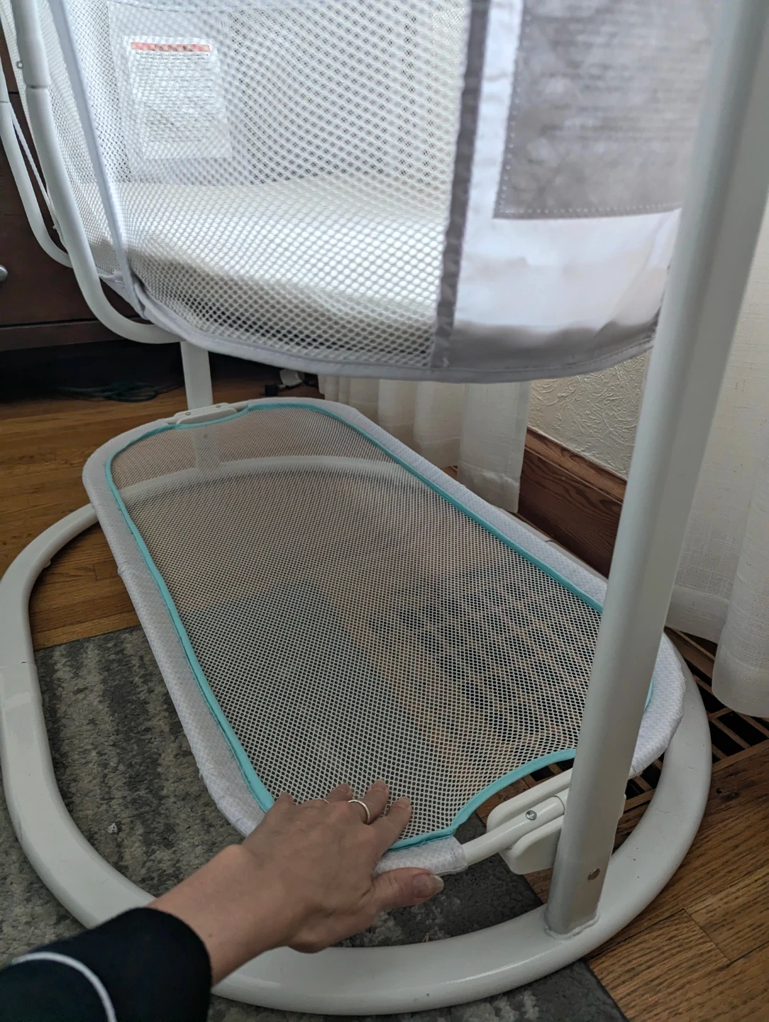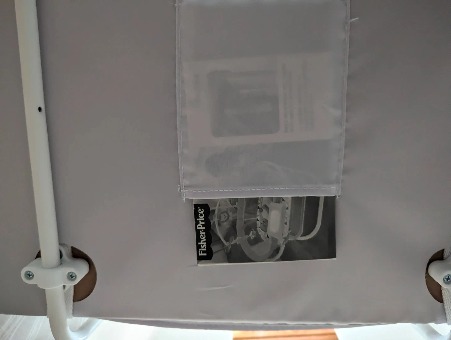 This is a Fisher-Price bassinet. It has mesh sides for airflow and a supportive mattress. A lower storage shelf is included.