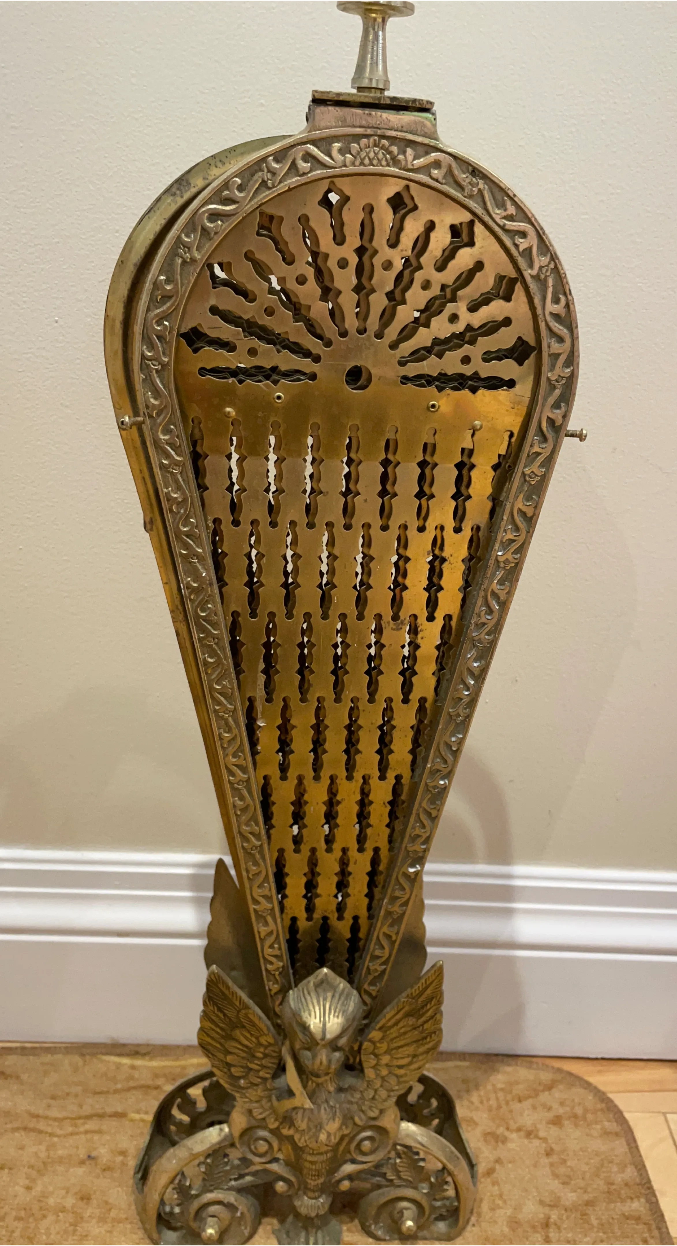 Vintage brass fireplace bellows with a decorative griffin base and ornate filigree detailing. It's a lovely accent piece for any hearth!