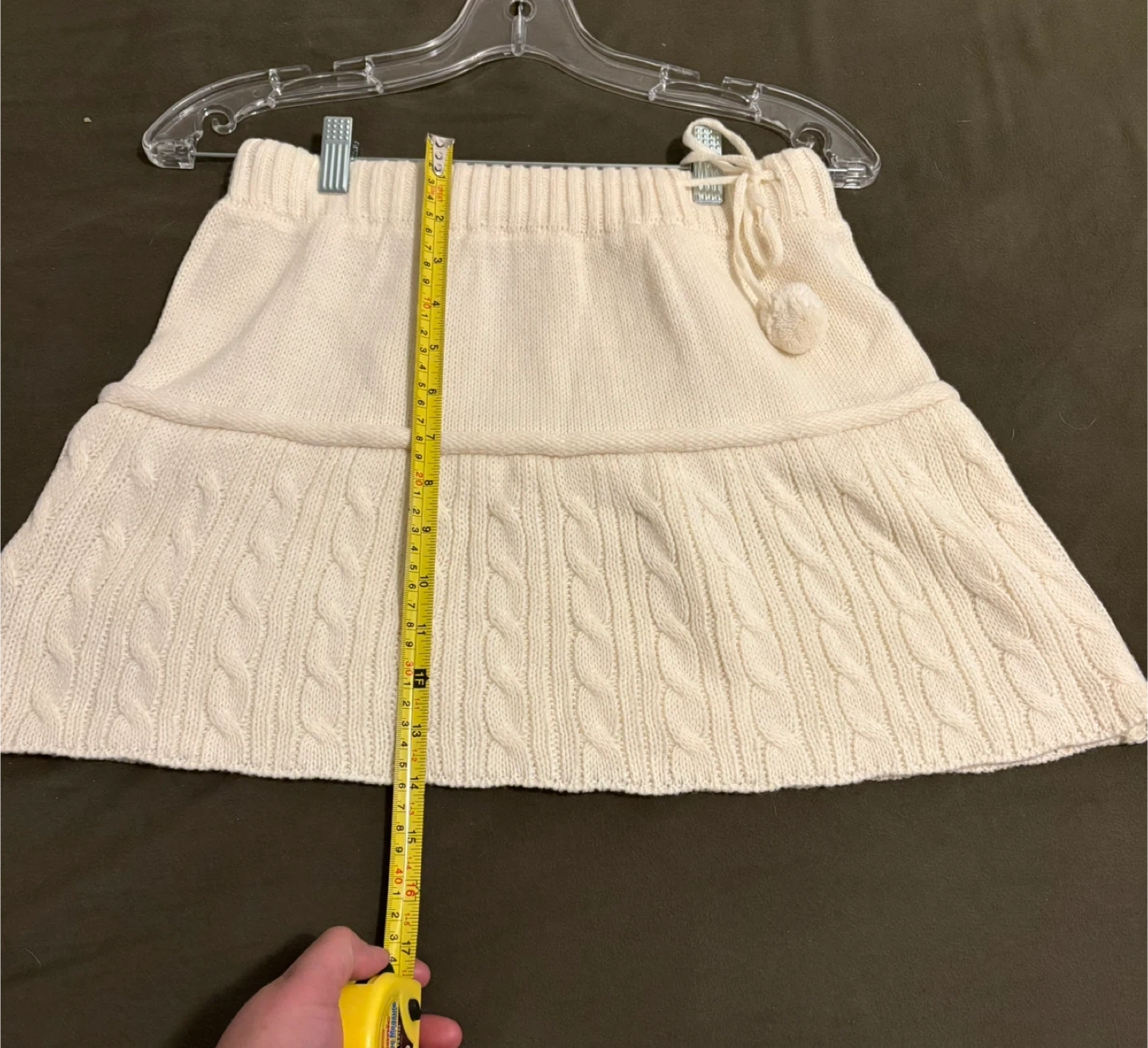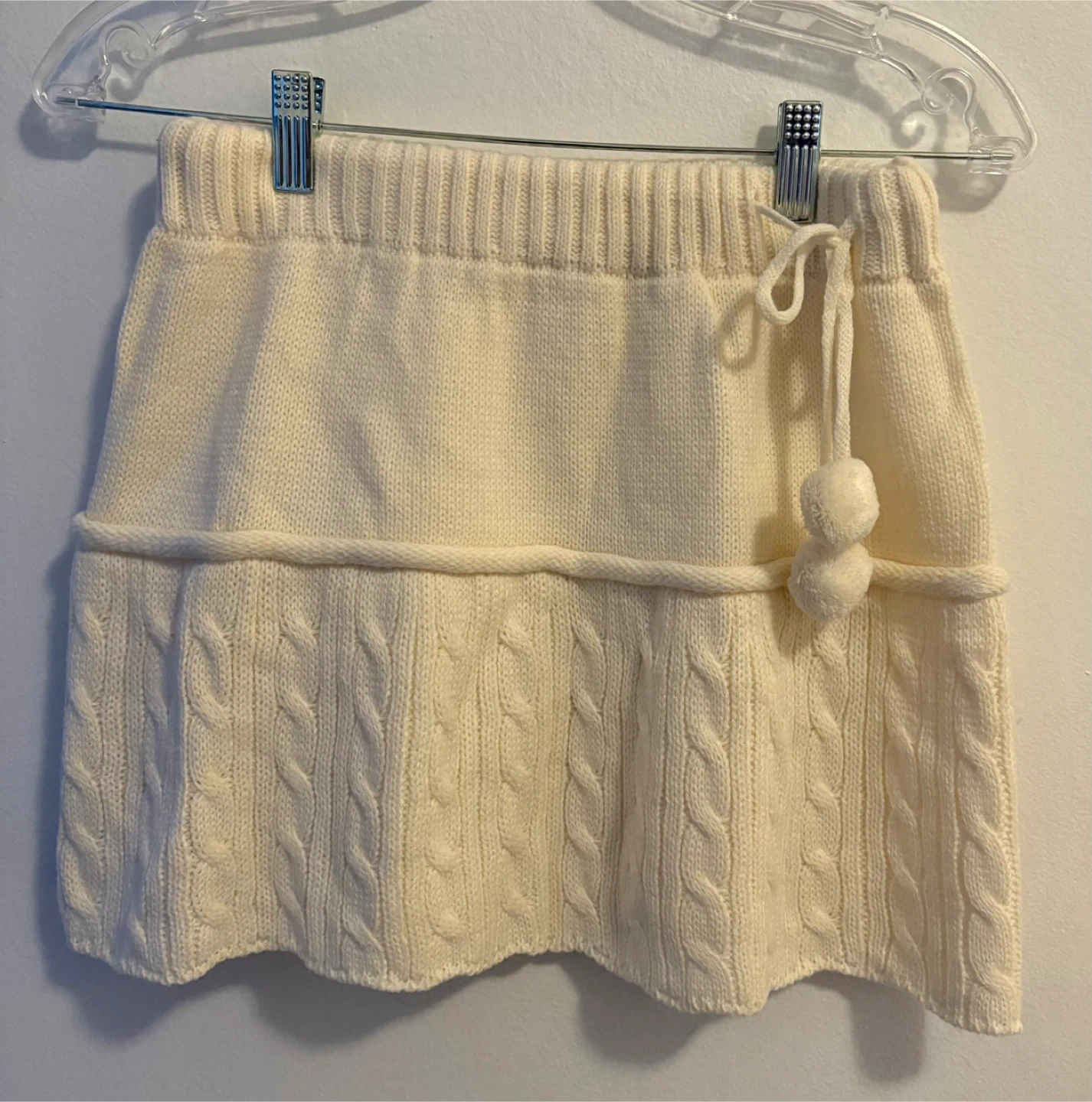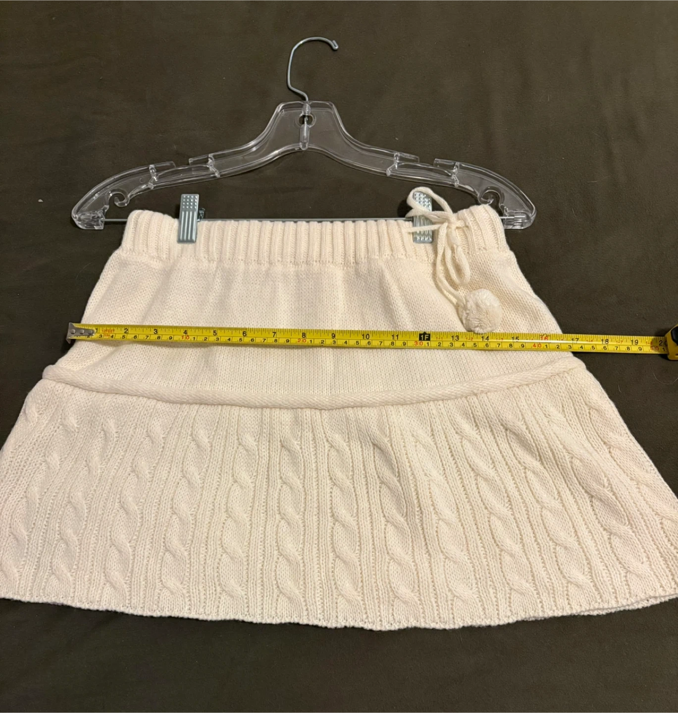 Cream knit mini skirt with a cable knit pattern. Made of 100% polyester. Waist measures approximately 13 inches laid flat. Length measures approximately 17 inches.