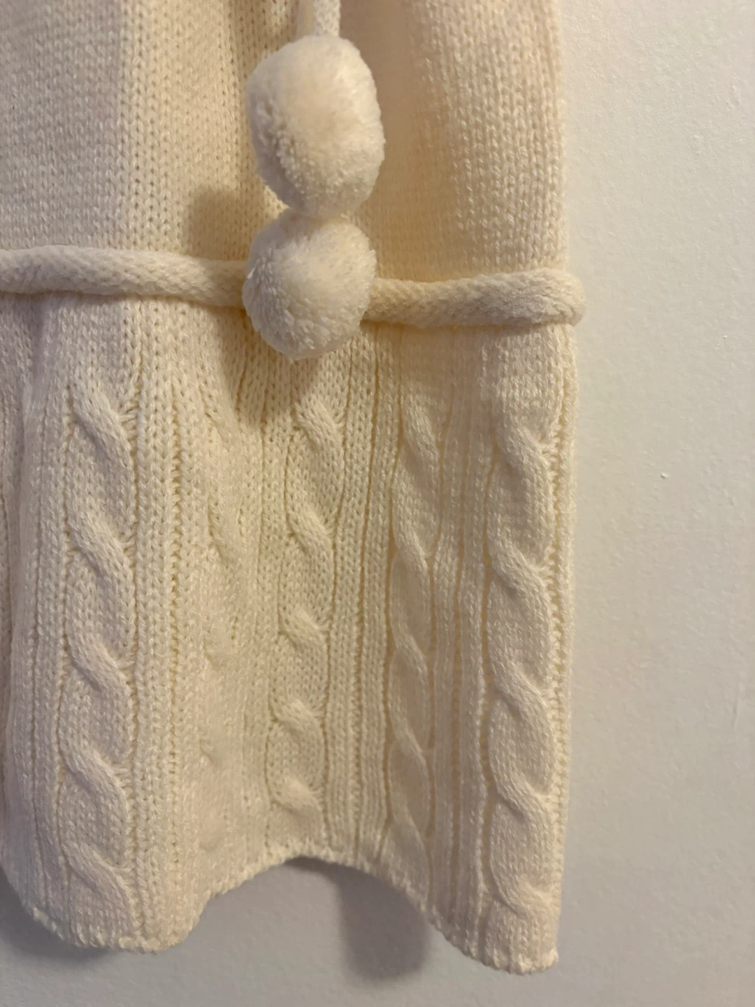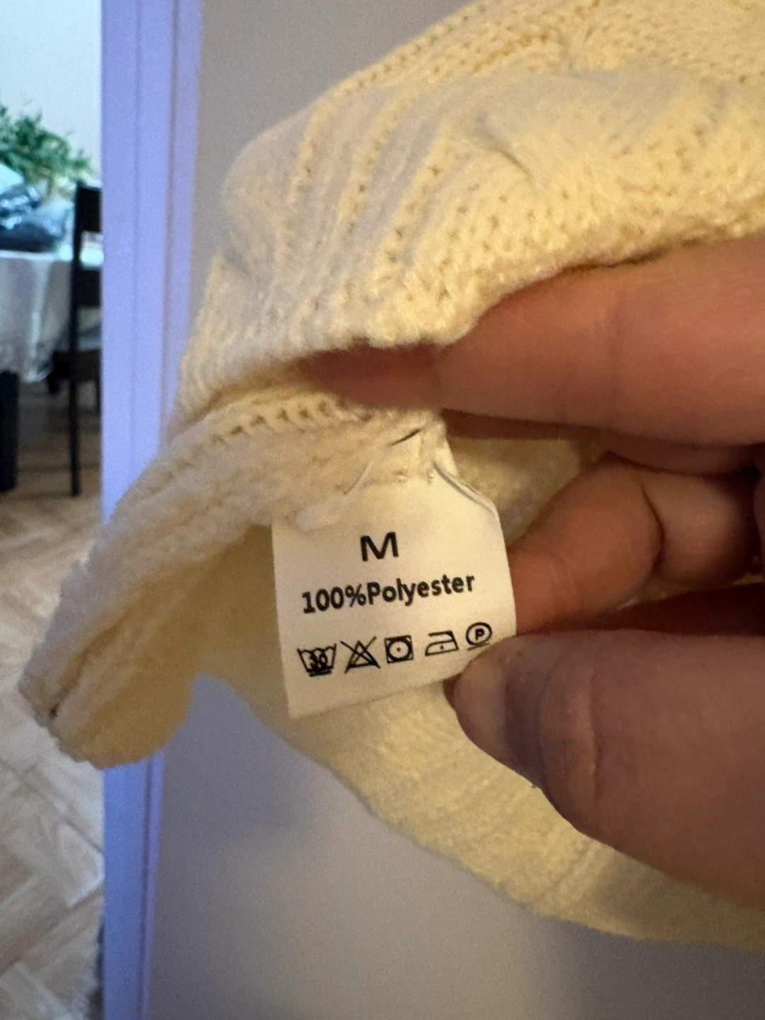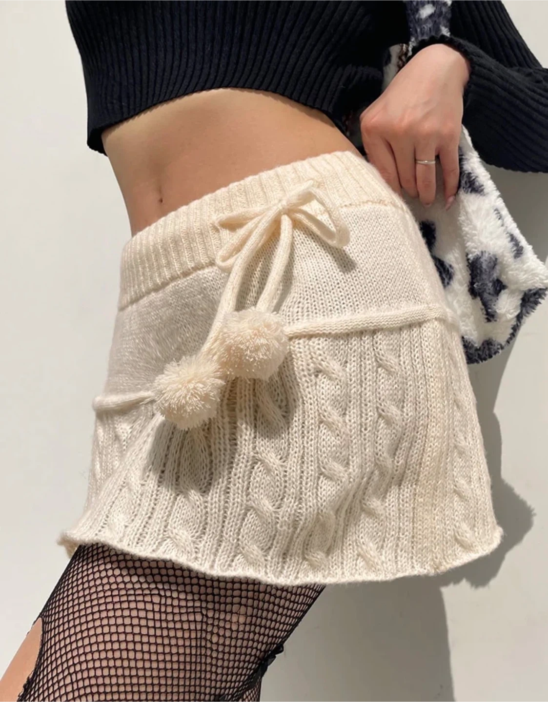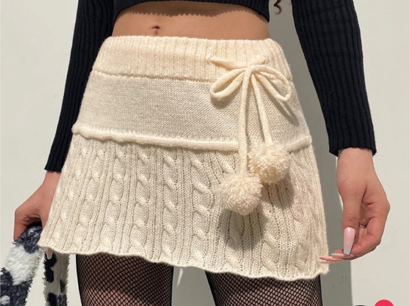 Cream knit mini skirt with a cable knit pattern. Made of 100% polyester. Waist measures approximately 13 inches laid flat. Length measures approximately 17 inches.