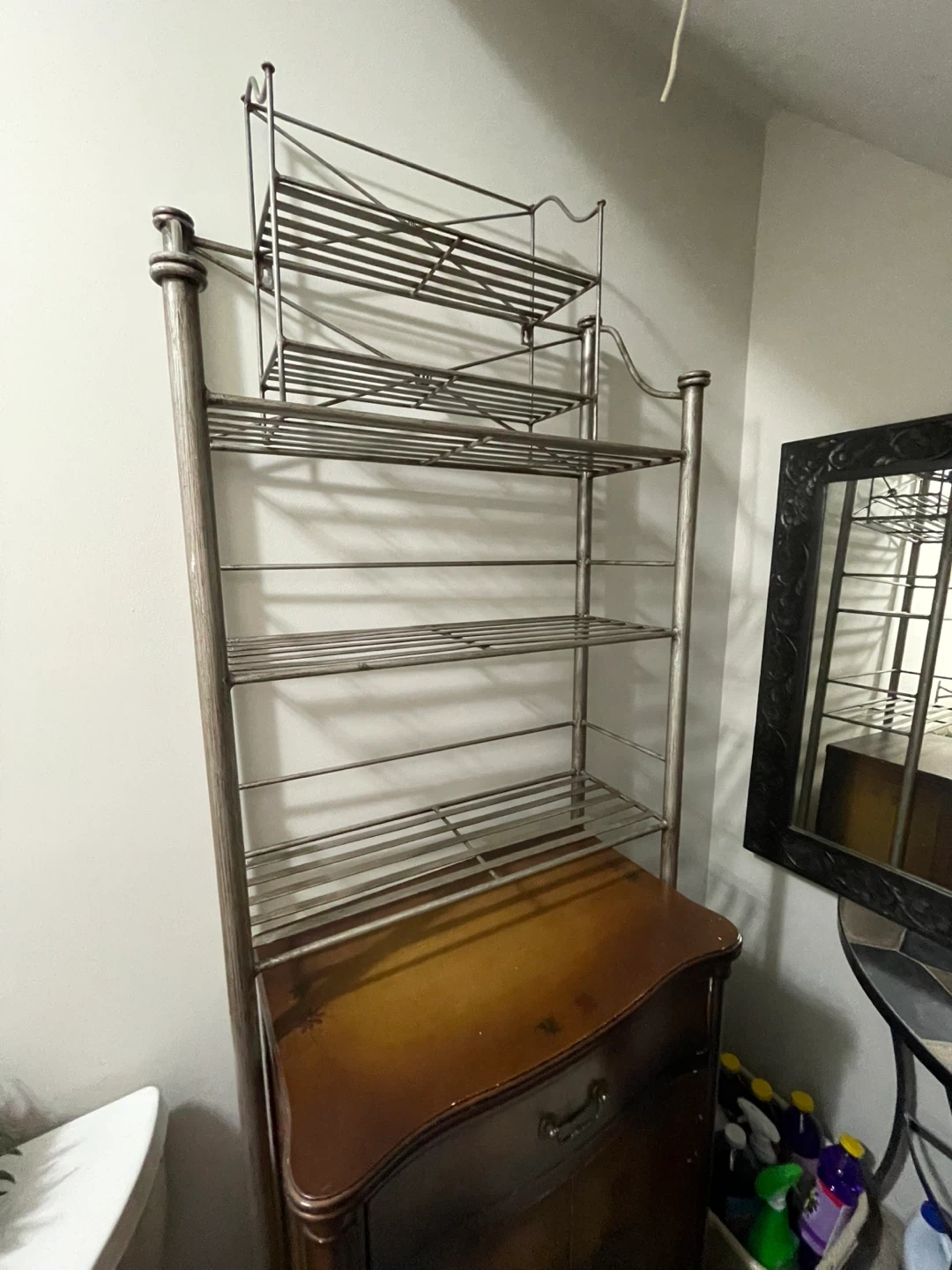 A tall metal wire shelf unit with multiple levels. It's made of a silver-toned metal and features a tiered design. This shelf unit offers ample storage space for various items.