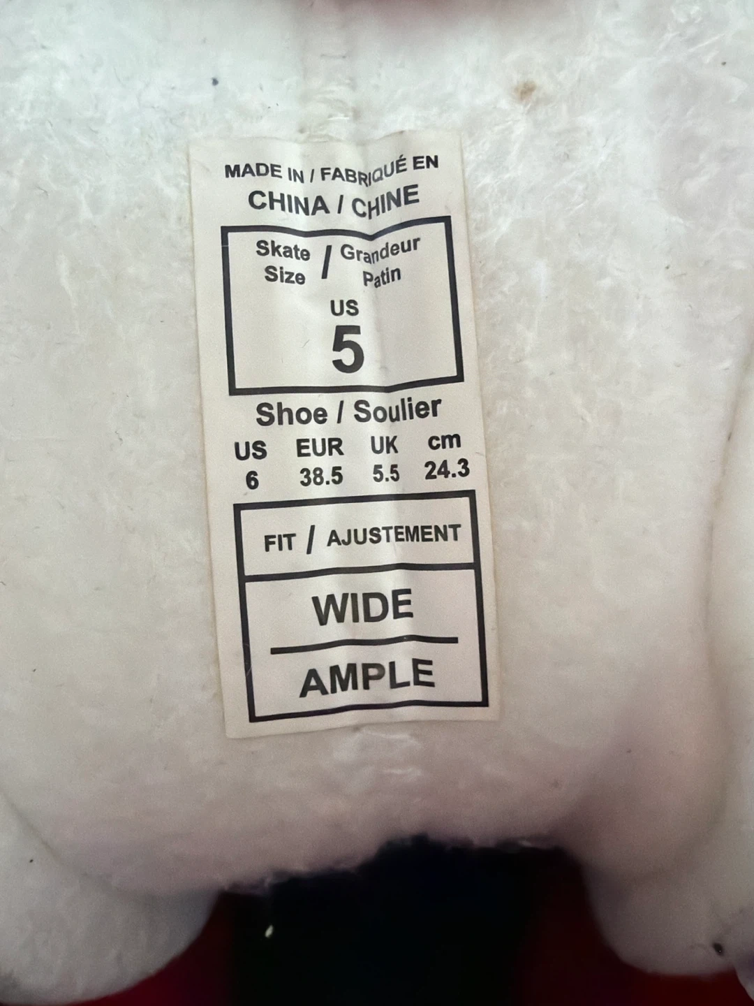 These CCM JetSpeed hockey skates are size 5 US (6 US Shoe, 5.5 UK, 38.5 EUR, 24.3 cm). They feature a wide fit and are designed for performance on the ice. Get ready to hit the rink!