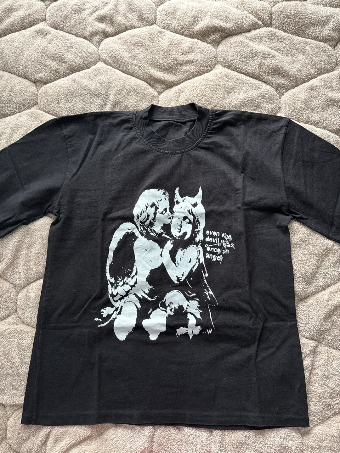 This is a black t-shirt with a graphic print on the front. The print features the text "even the devil was once an angel". It's made of cotton, bought from germany, oversize.