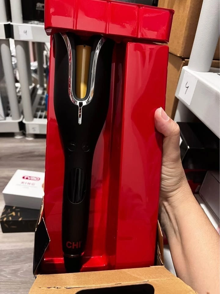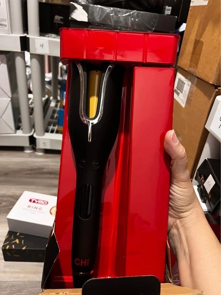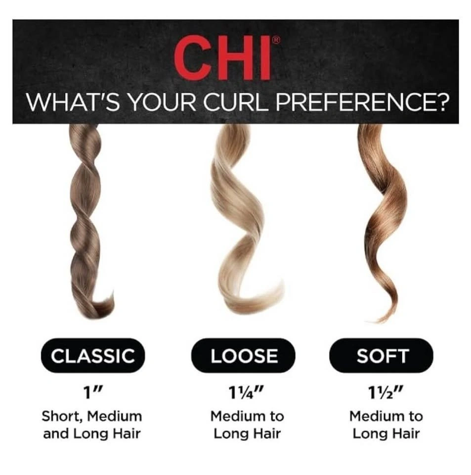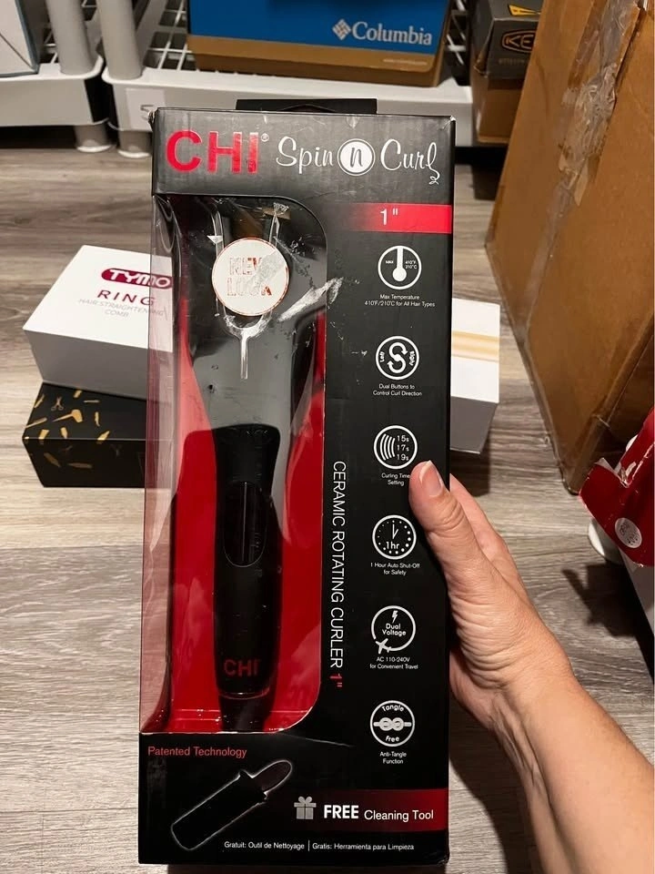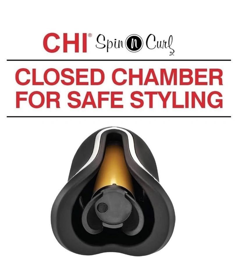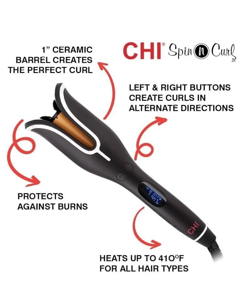 New Open Box CHI Air Spin N Curl 1 Inch Ceramic Rotating Curler. Create flawless curls and waves with the CHI Spin N Curl! The digital temperature display offers a selection of preset temperature settings for each hair texture, helping you avoid unnecessary heat damage. Hair is drawn into the curl chamber where it is heated and timed to create perfect curls and waves every time! Designed with titanium-infused ceramic plate technology. Digital temperature control for quick set up, non-stick styling surface for hair body & bounce, & non-slip handles. To use: Choose desired temperature. Insert a ¾” to 1” section of hair into opening (avoid inserting more to prevent tangling). Hold down arrow button to curl the hair & release once hair is in the chamber. Wait for 4 beeps to signal the hair is set. Key Features: 1” Ceramic Rotating Barrel, 410°F Maximum Temperature, Directional Buttons, Tangle Protection, Includes Pre-set Temperatures (Low 370°F for Fine Hair, Medium 390°F for Medium Hair, High 410°F for Coarse Hair), Includes Adjustable Heat-Up Times (15 seconds for Fine Hair, 17 seconds for Medium Hair, 19 seconds for Coarse Hair), Temperature Display, Beep Alert, Auto Temperature Lock, 1-hour Auto Shut Off For Safety, 9 ft. (2.7 m) Swivel Cord for Convenience, Dual Voltage for Convenient Travel.