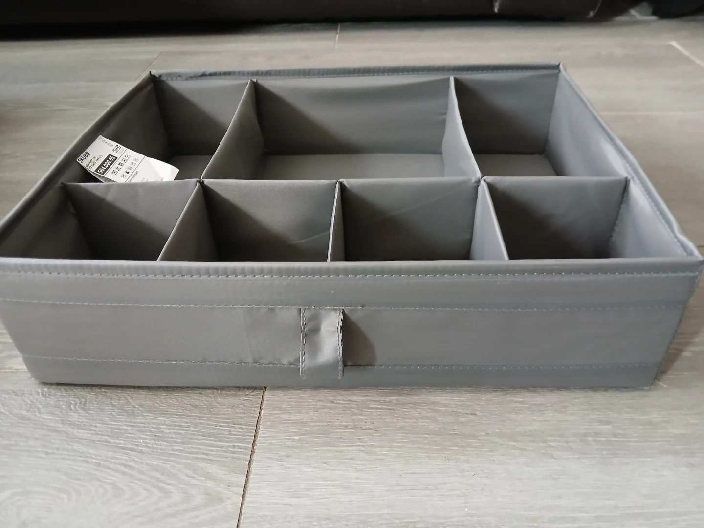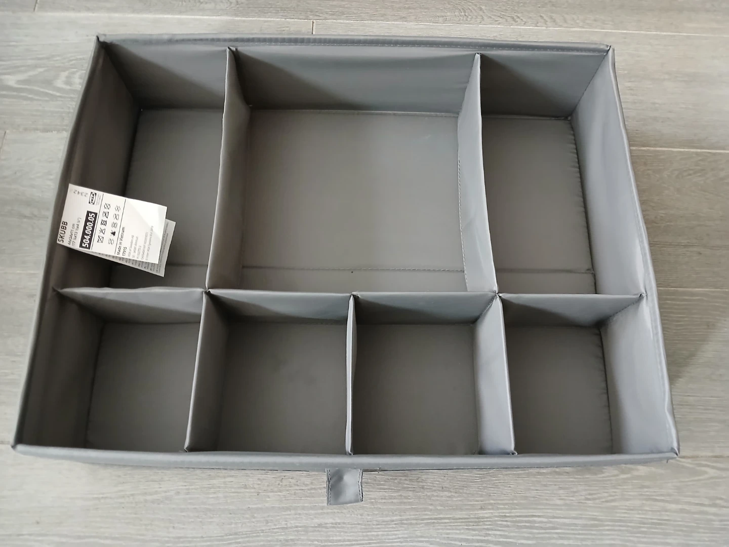 This is an IKEA SKUBB storage box. It's grey and measures 44 x34 x11 cm. It has 8 compartments for organizing items.