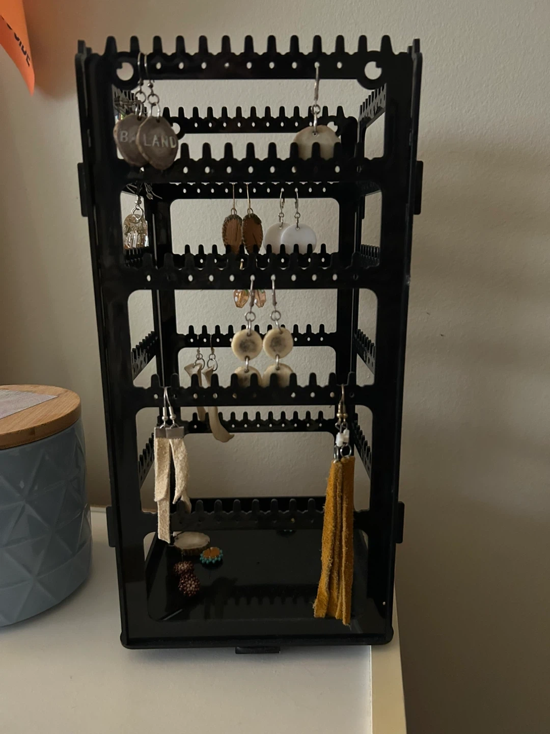 This black jewelry organizer stand has four tiers with multiple slots for hanging earrings and necklaces. It's great for keeping your accessories tidy and on display. The stand rotates for easy access to all your items!