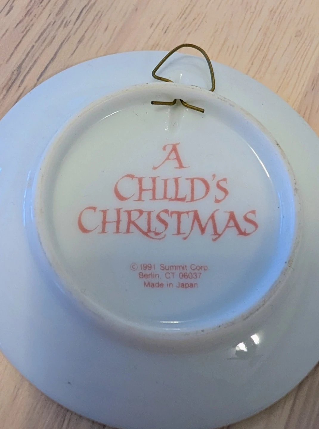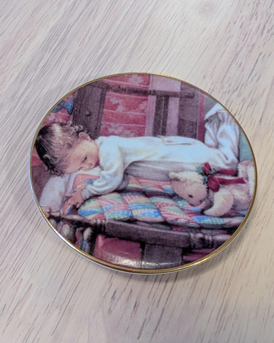 This is a decorative plate titled 'A Child's Christmas'. It features a charming image of a sleeping baby with a teddy bear. Manufactured in Japan by Summit Corp in 1991.