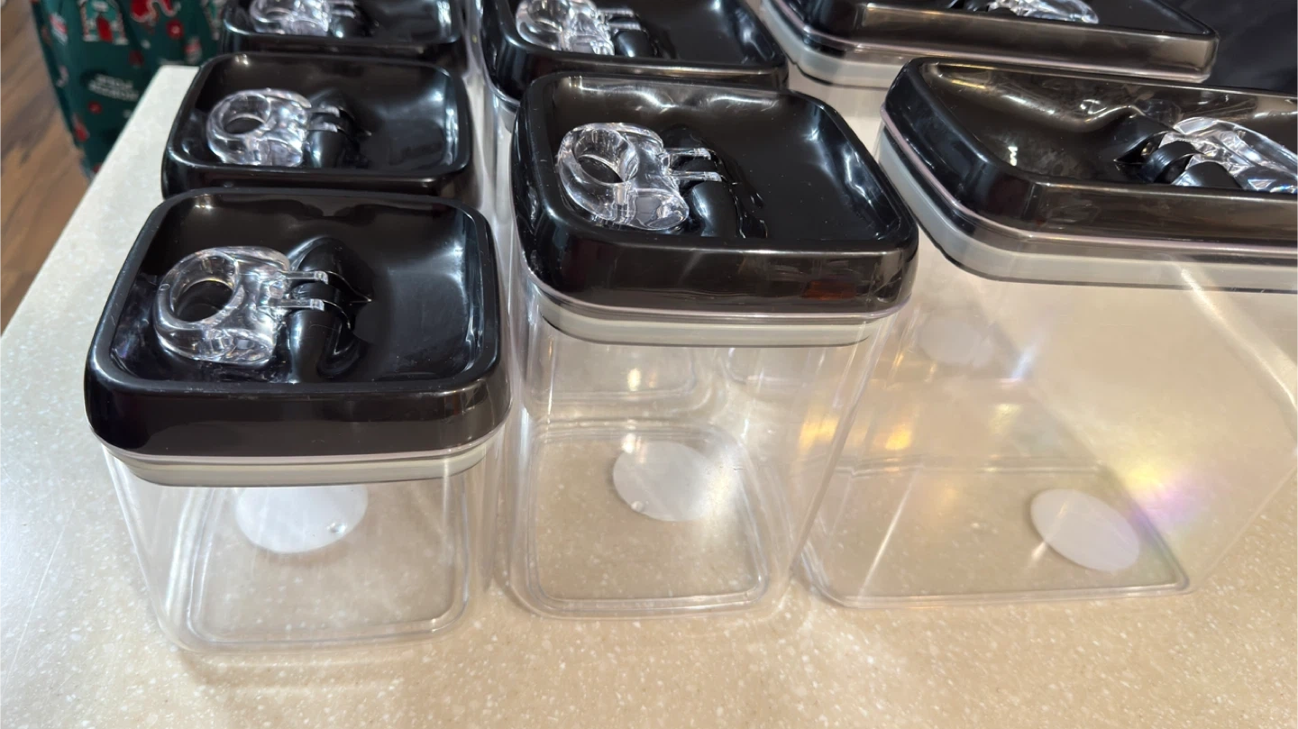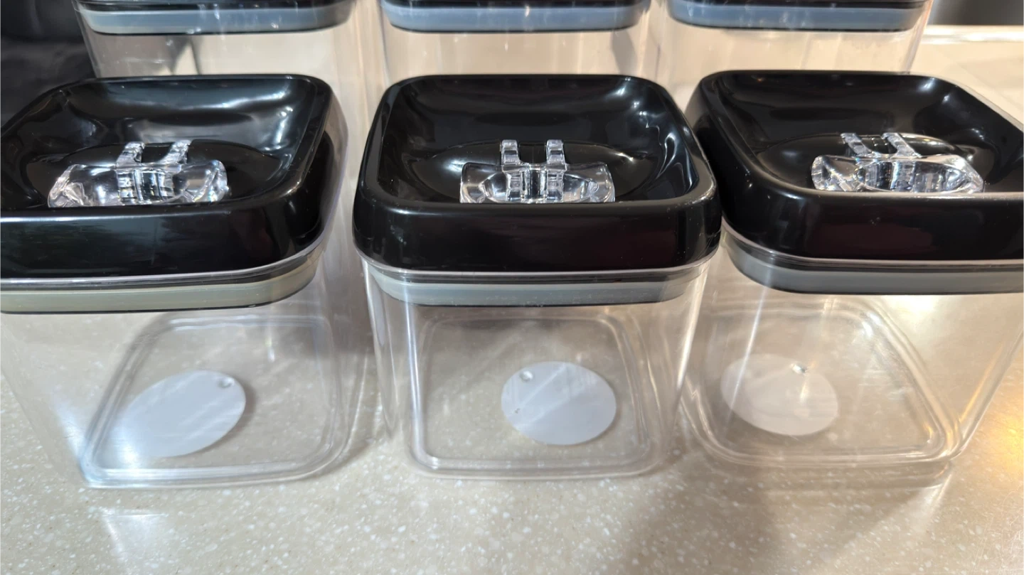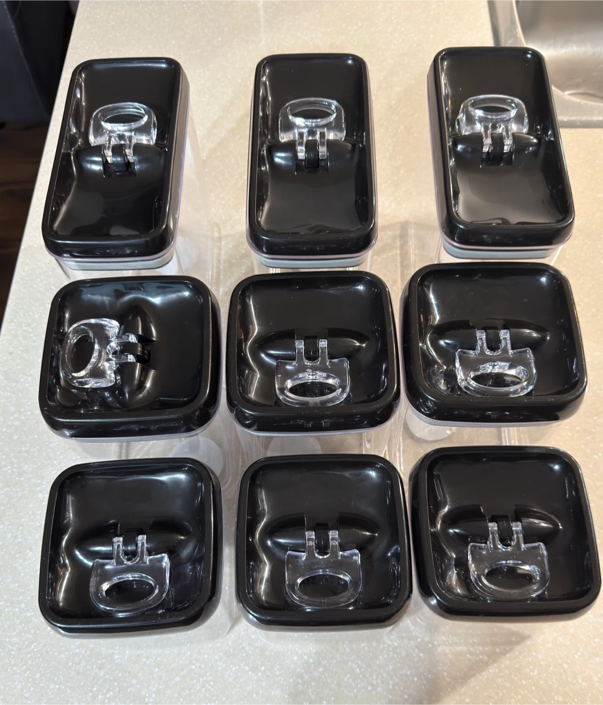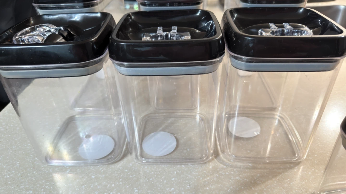 This is a set of 9 boxes airtight food storage containers. They feature a black lid with a clear push-button mechanism for easy sealing. These clear plastic containers are great for organizing your pantry or fridge. They're durable and designed to keep your food fresh!