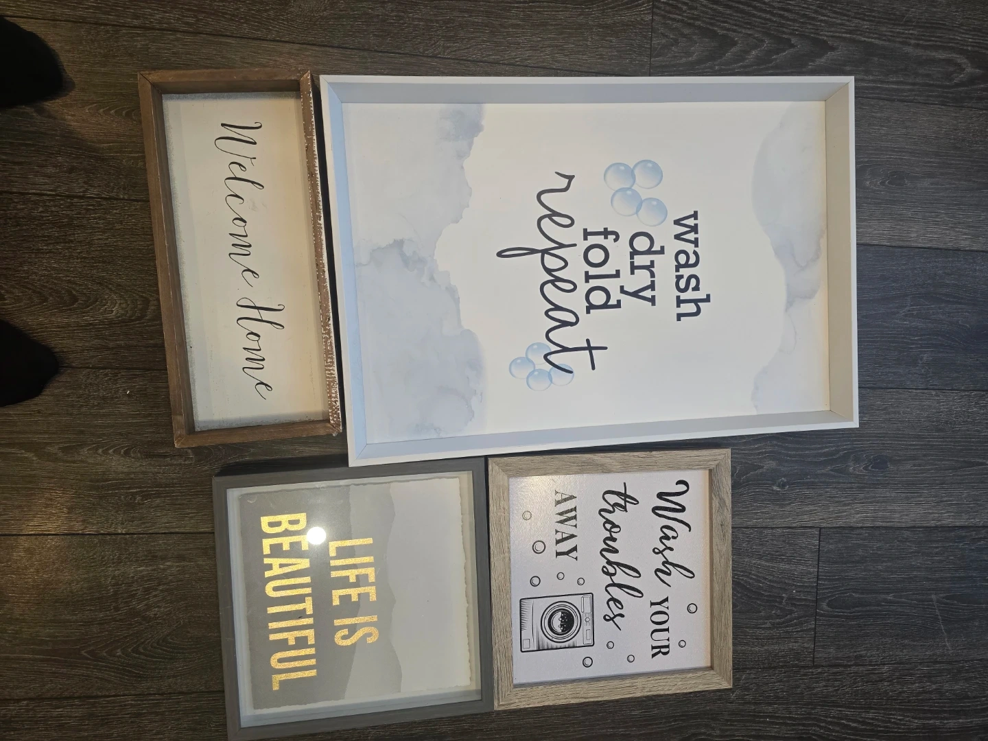 This set includes four decorative wall signs with various sayings. One sign says 'Welcome Home', another says 'wash dry fold repeat' and features bubbles. A third sign reads 'LIFE IS BEAUTIFUL' in gold lettering. The final sign has a washing machine graphic and states 'Wash YOUR troubles AWAY!' These are great for adding a touch of personality to your home.