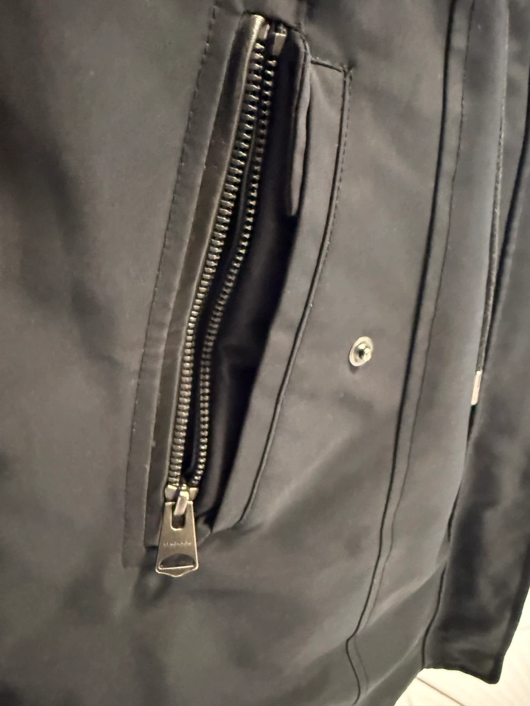 MACKAGE black down-filled parka jacket. It's insulated for warmth and features a hood. Zipper closures and pockets are visible.