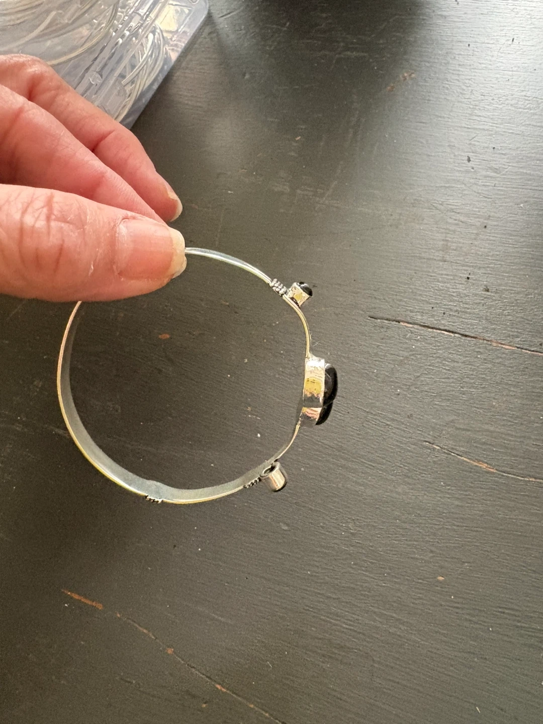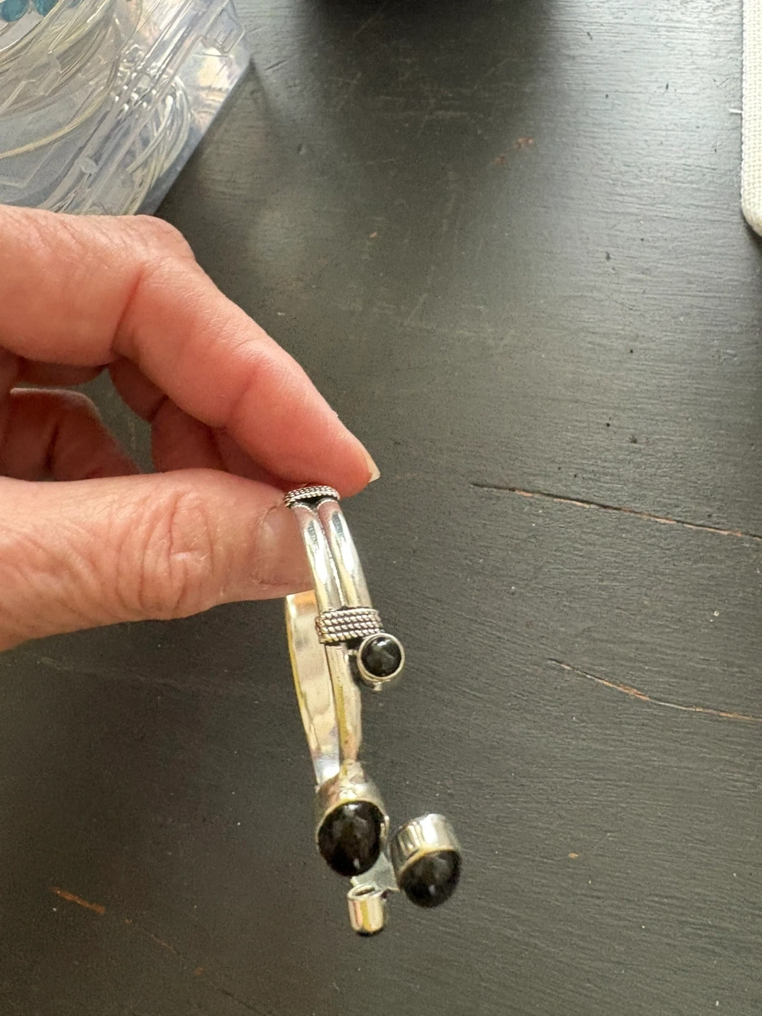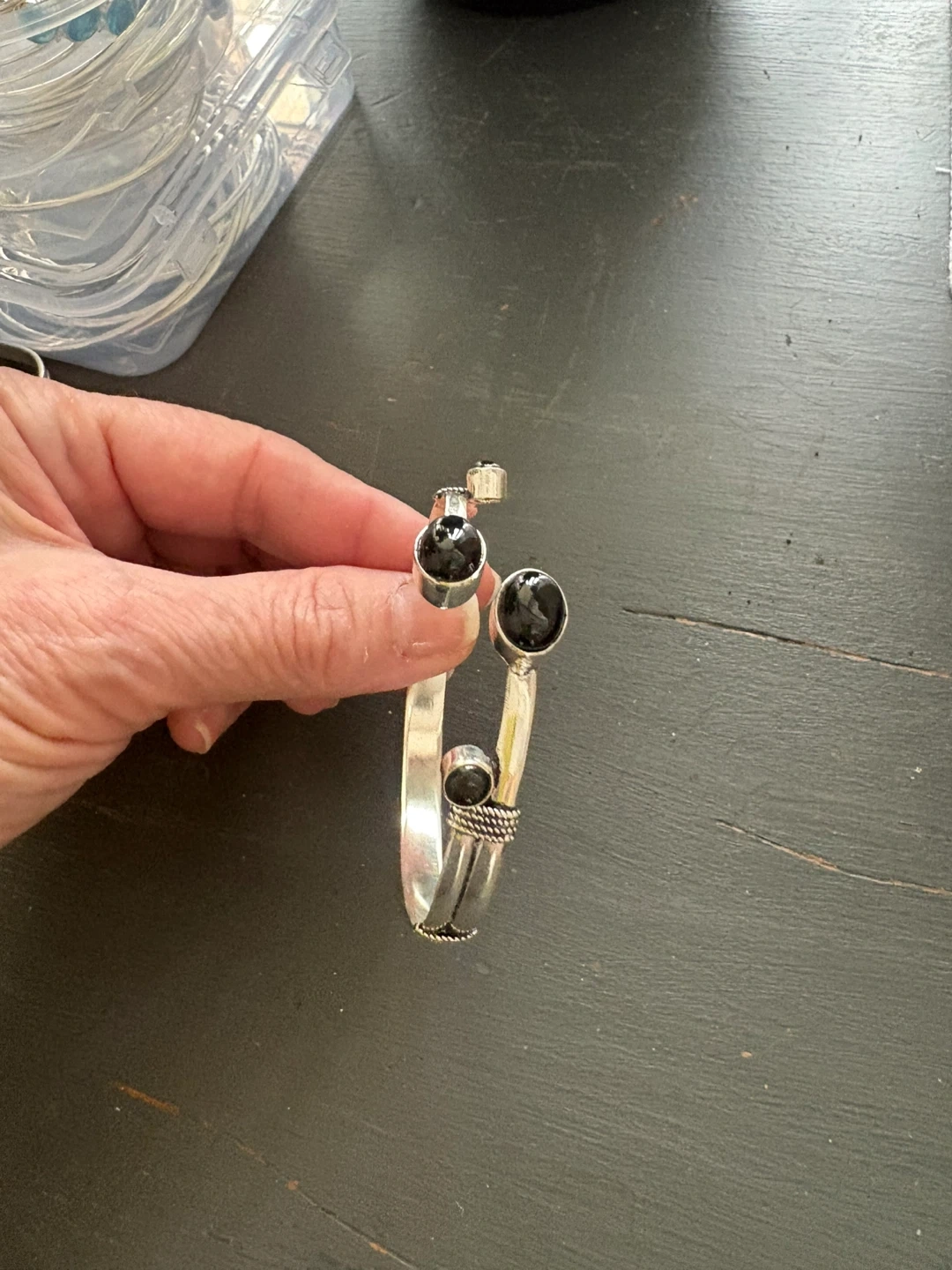 This silver cuff bracelet is adorned with three onyx stones. It's a stylish accessory that can be worn for many occasions. The bracelet is adjustable for a comfortable fit.