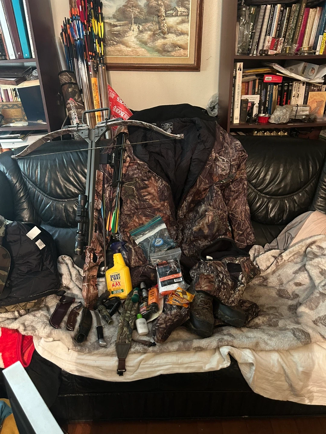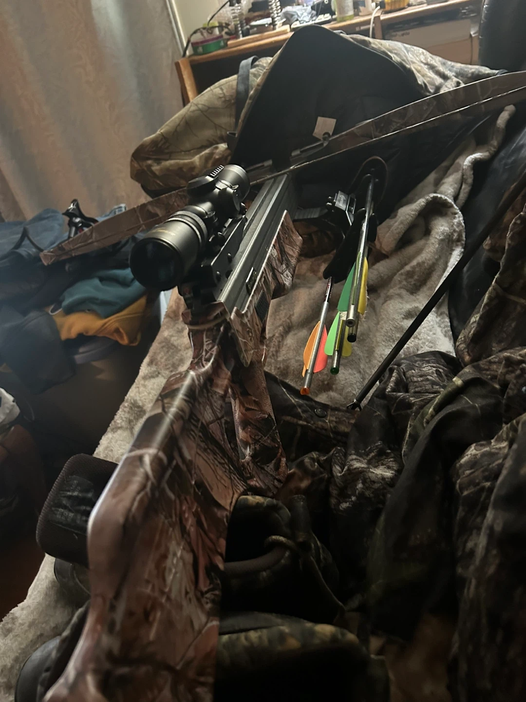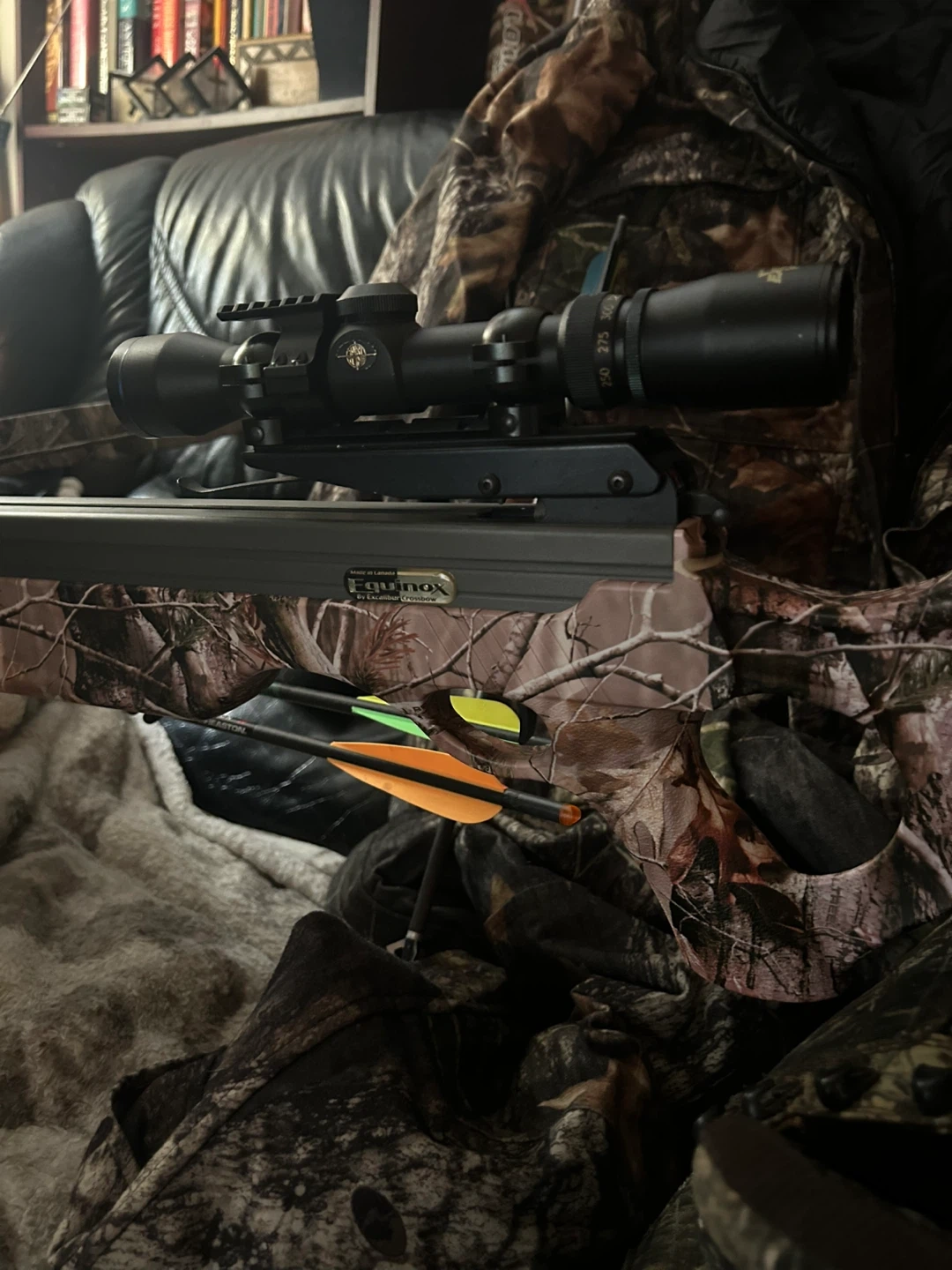 Excalibur Equinox crossbow with Equinox scope. Features 350 FPS velocity, 15.5" power stroke, 165 lbs draw weight, and 30" arrow length. Includes 4 arrows and RedHead boots.