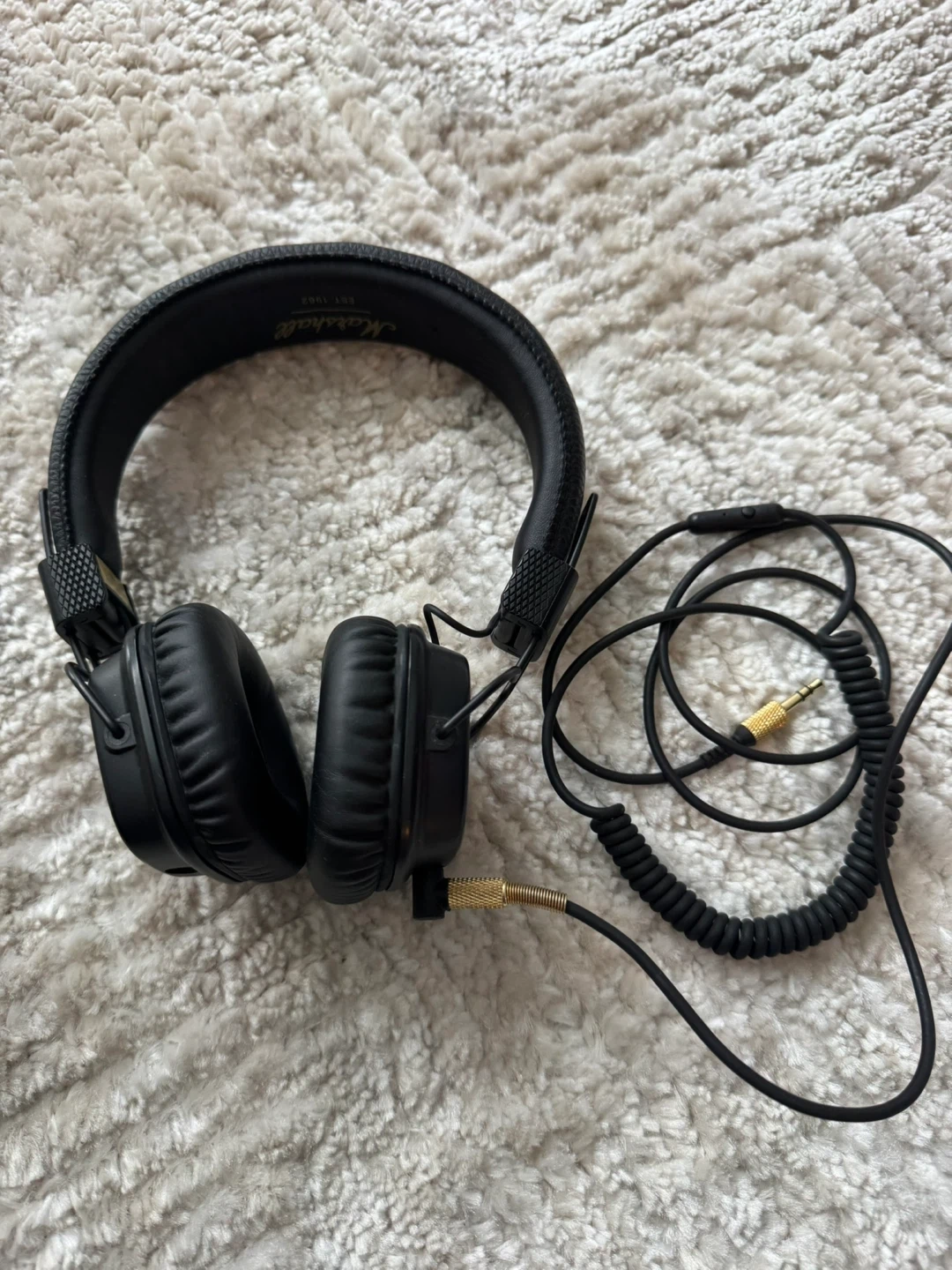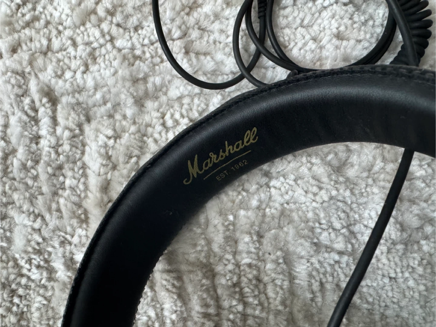 Marshall on-ear headphones in black. Comes with a coiled audio cable. Some minor wear visible on the headband.