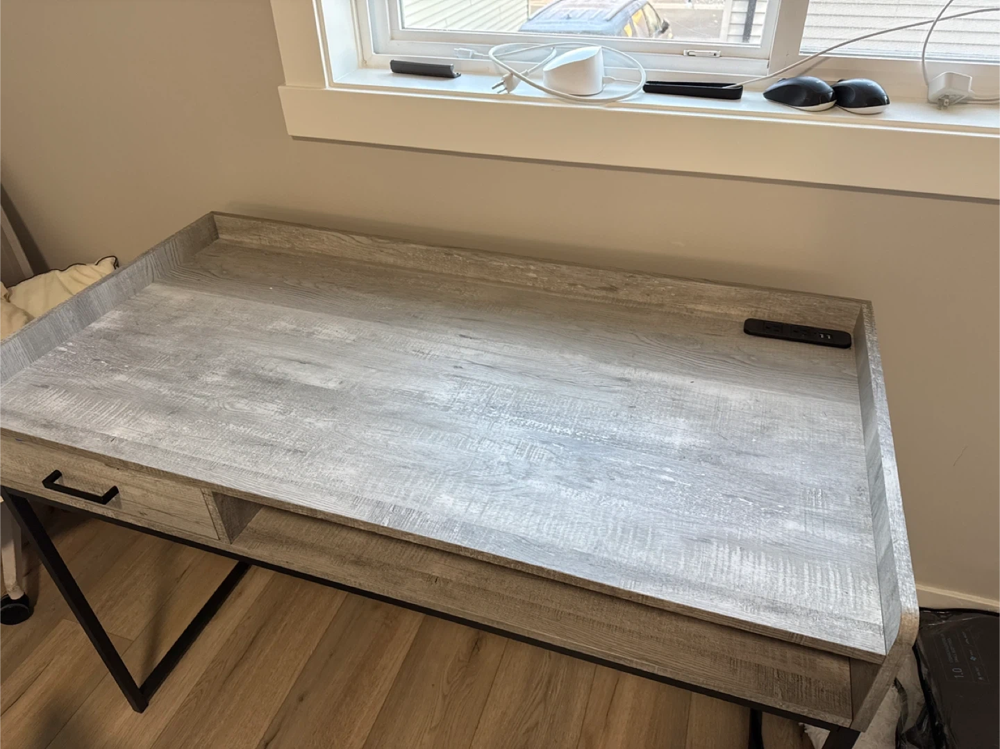 This is a wood grain desk featuring a single drawer and an open shelf. It has a modern metal frame. The desk's surface has a textured wood grain finish.