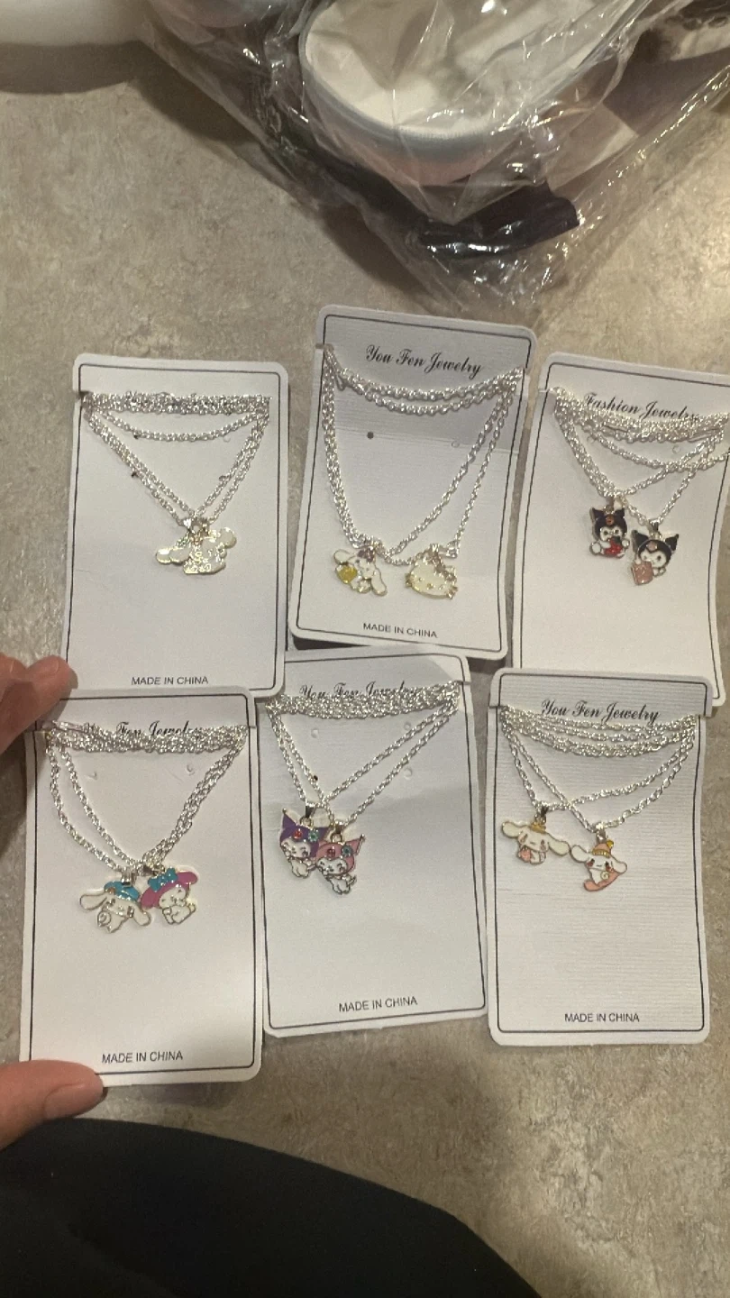This is a set of 6 necklaces featuring various Sanrio characters like Hello Kitty and Cinnamoroll.