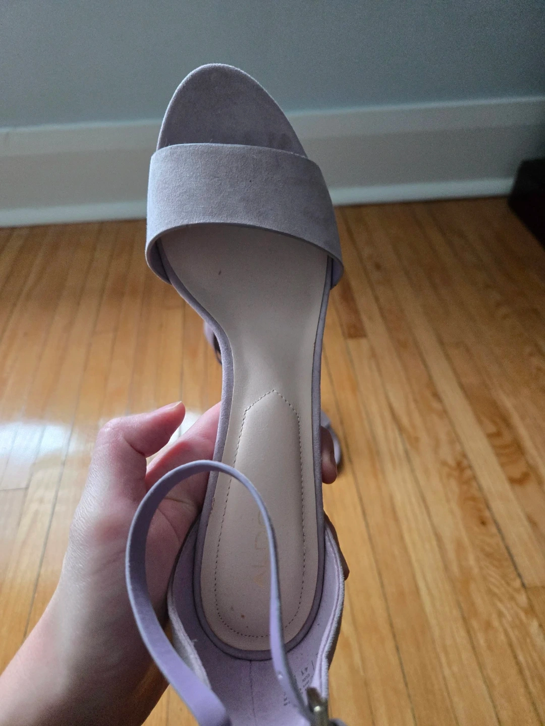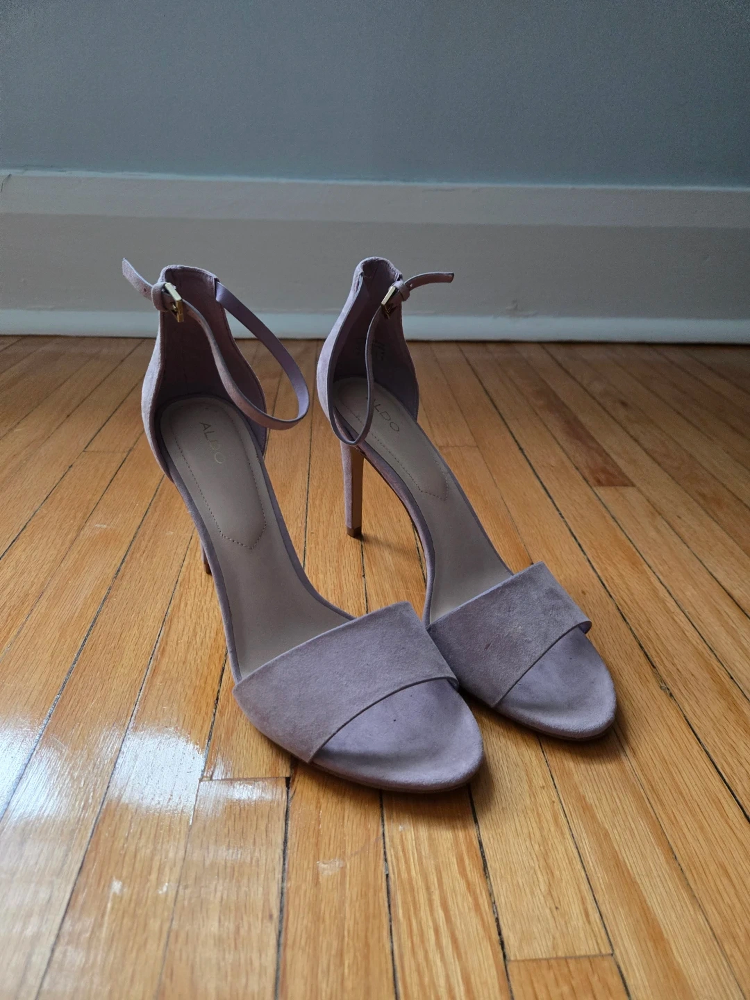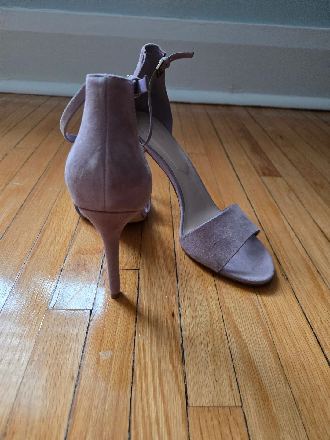 ALDO heels in a lovely lilac suede. These sandals have a comfortable strap around the ankle and a chic open toe design. Perfect for dressing up an outfit! NEVER WORN