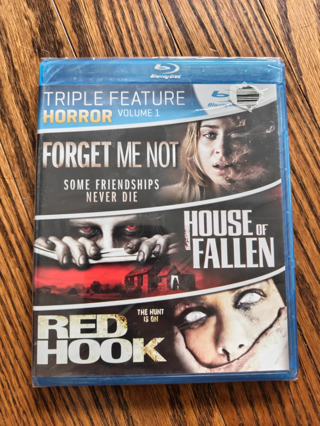 This is a triple feature Blu-ray collection of horror films, including Forget Me Not, House of Fallen, and Red Hook. All movies are in widescreen format with 5.1 Dolby Digital Surround sound. Get ready for some scares!