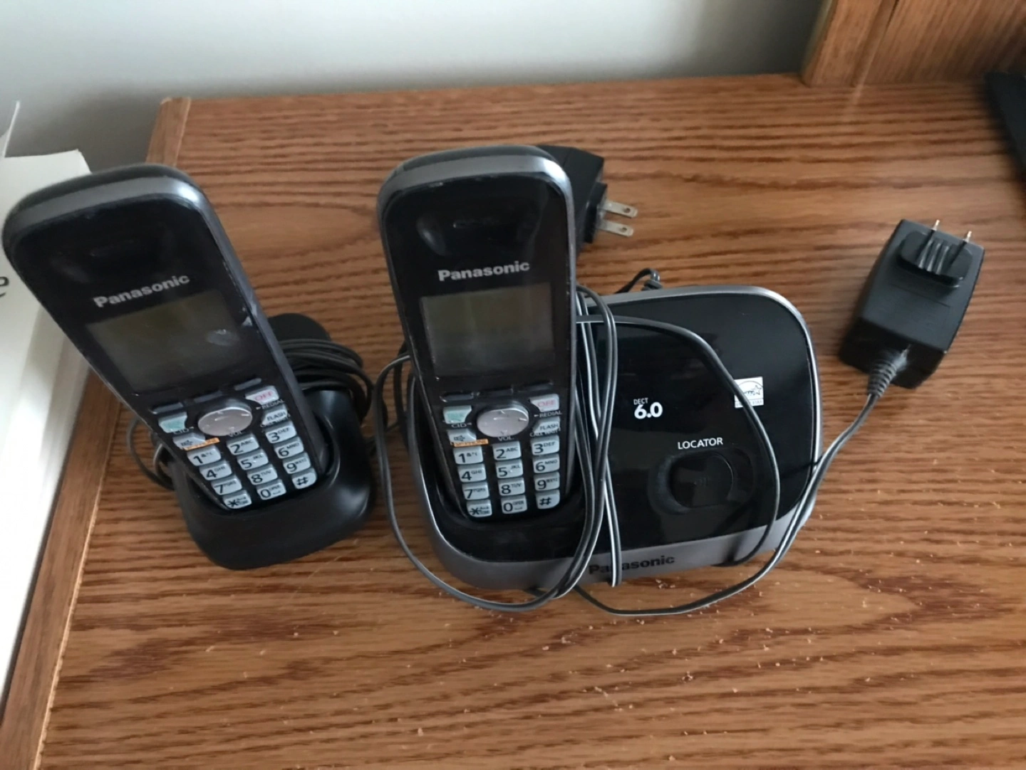 Panasonic DECT 6.0 cordless phone system. Includes base station, two handsets, and two power adapters. Features DECT 6.0 technology for clear calls.