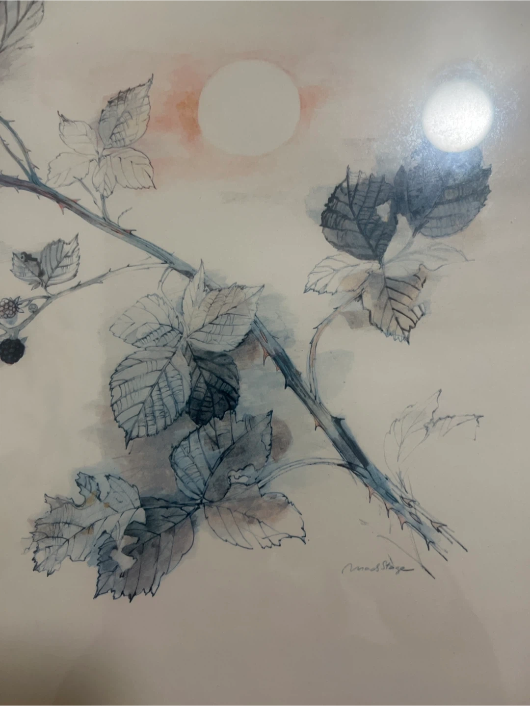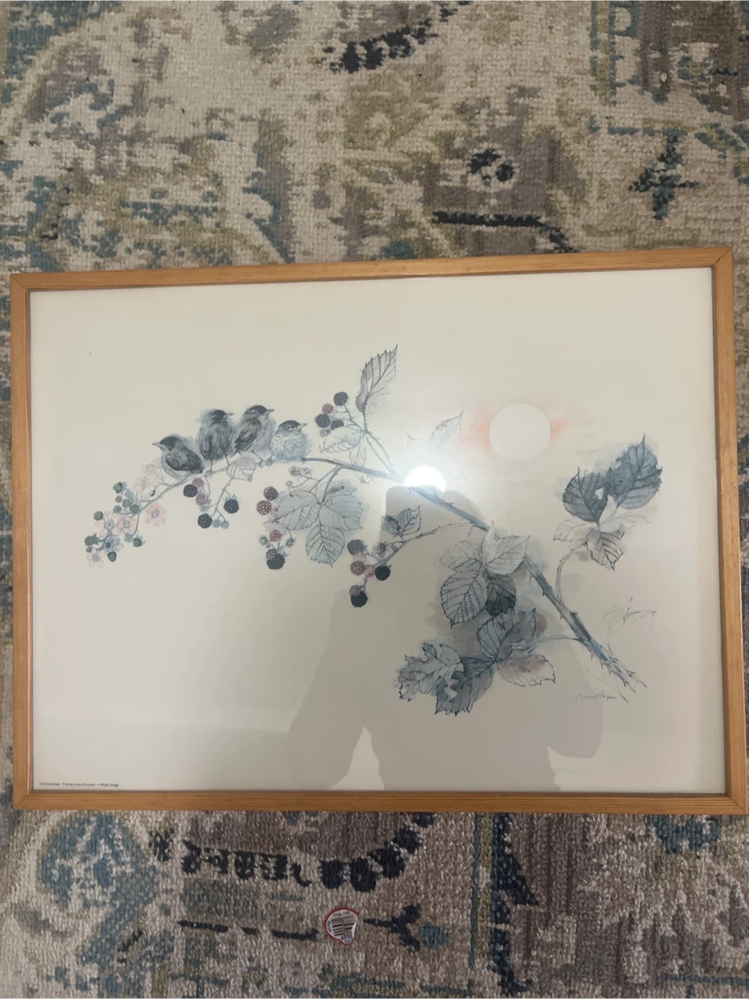 A charming watercolour print featuring a group of young birds perched on a branch with berries. It's housed in a simple wooden frame. This print would add a touch of nature to any room.