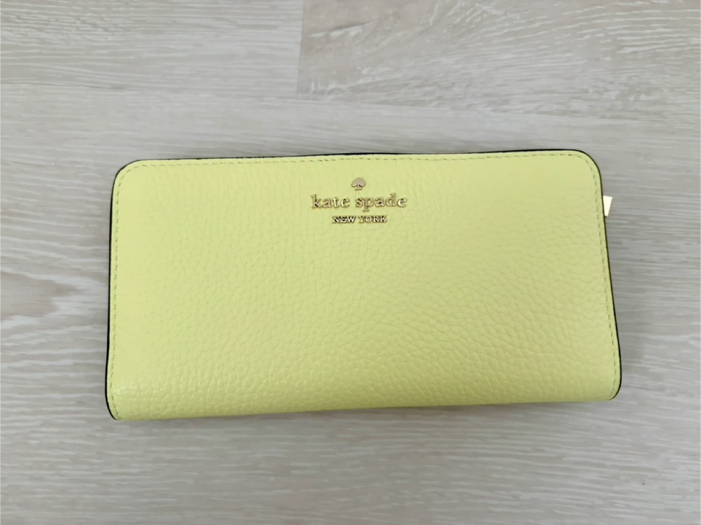 Brand new Kate Spade wallet in a light yellow pebbled leather. It features multiple card slots, a clear ID window, and a zip-around coin pocket.