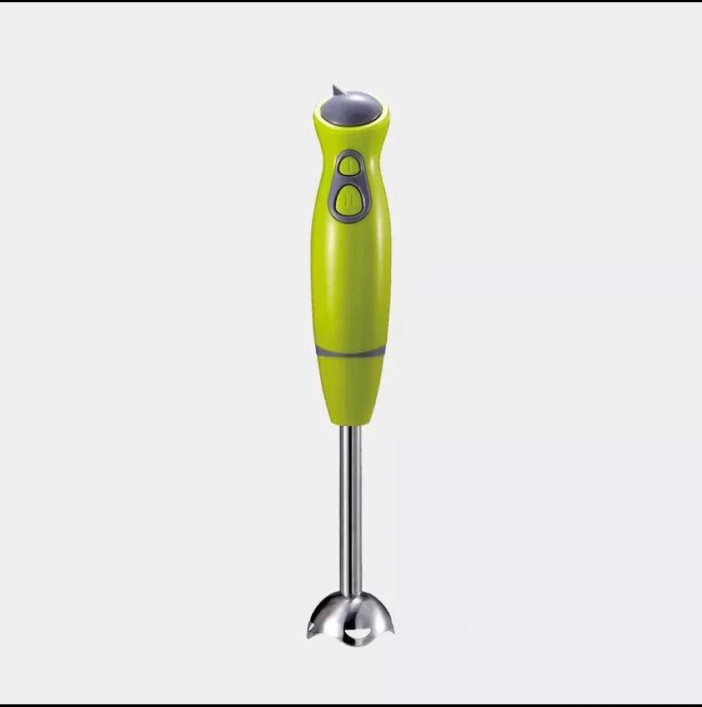 This is a handheld immersion blender. It's lime green with grey accents and a stainless steel blending shaft. Two buttons control its speed.