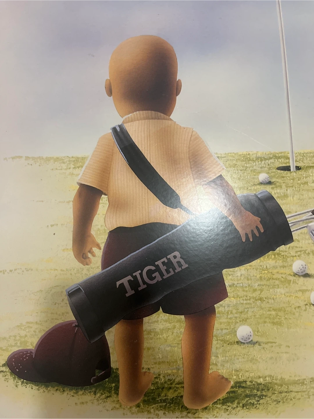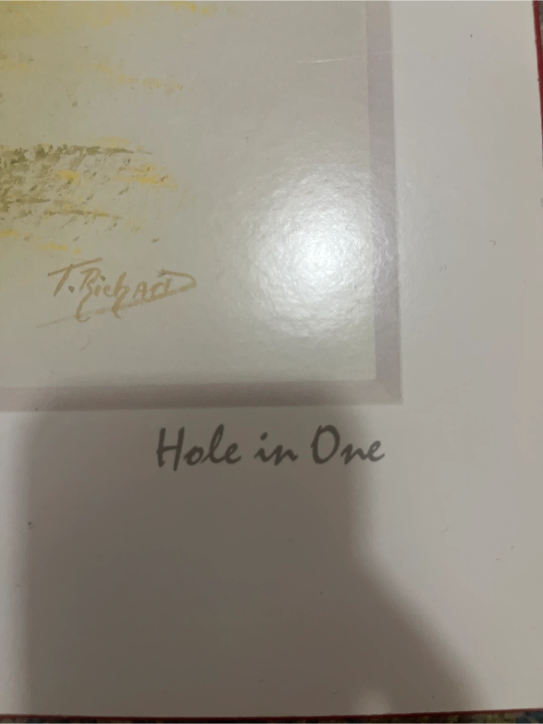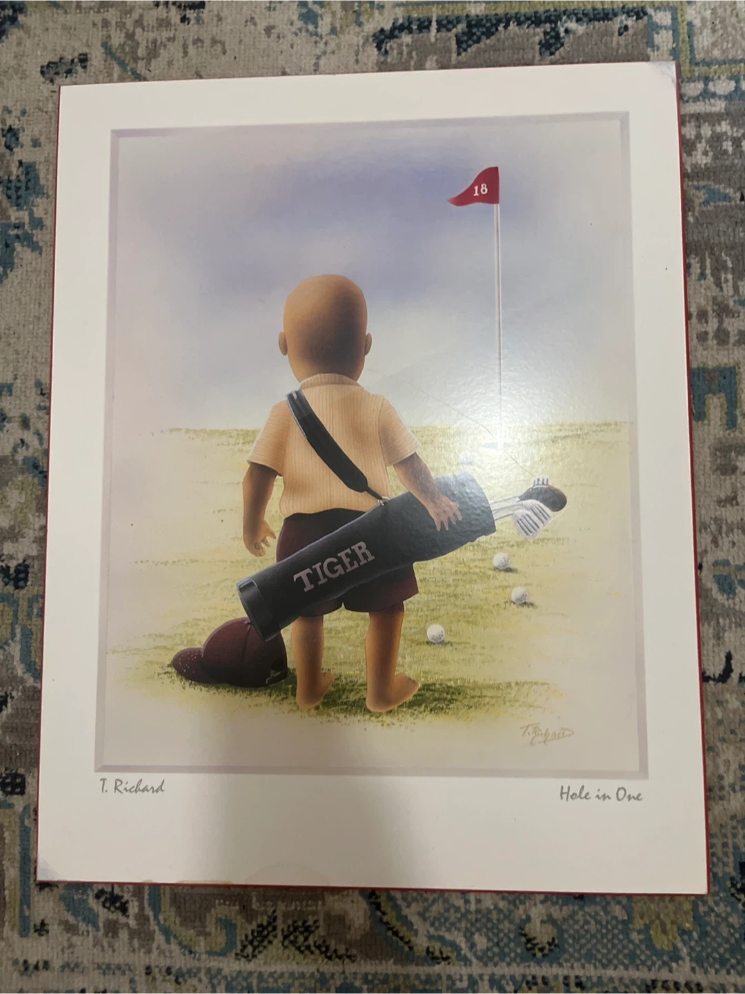 This is a print titled "Hole in One" by artist T. Richard. It depicts a young child with a golf bag labeled "TIGER" on a golf course. The artwork features a red flag with the number 18. A great piece for golf enthusiasts!