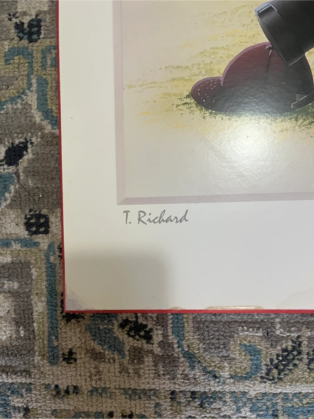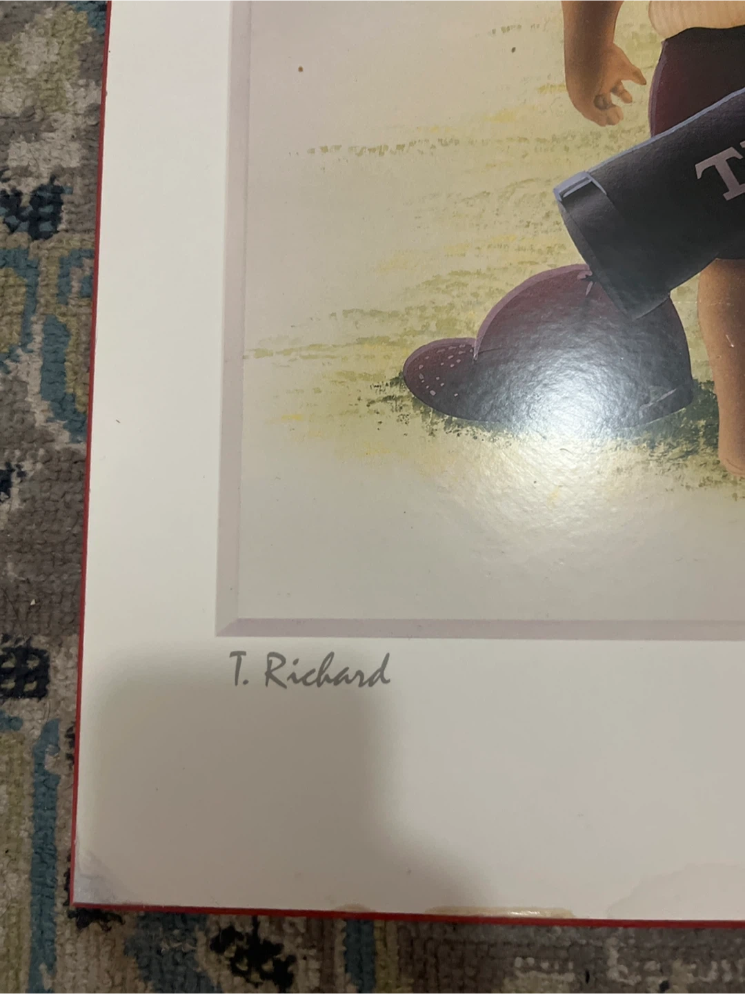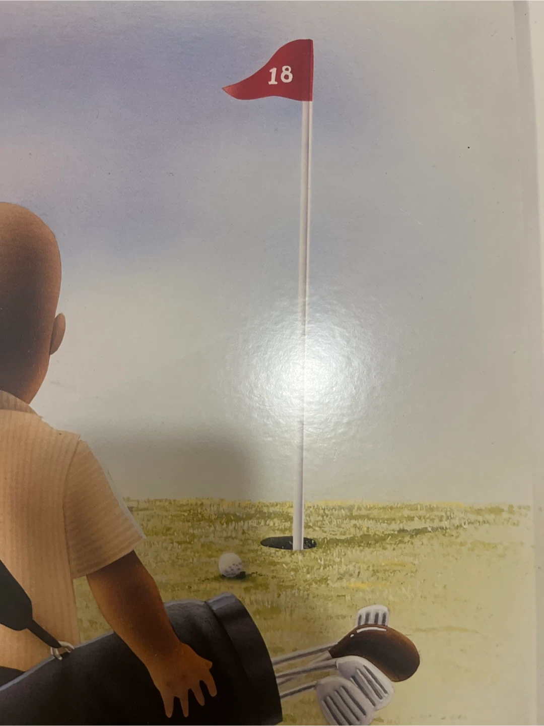 This is a print titled "Hole in One" by artist T. Richard. It depicts a young child with a golf bag labeled "TIGER" on a golf course. The artwork features a red flag with the number 18. A great piece for golf enthusiasts!