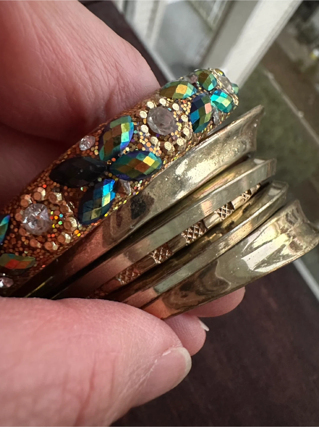 Set of assorted gold-tone bangles, including one decorated bangle with colourful rhinestones. Most bangles appear to be approximately 2.5 inches in diameter. These bracelets add a pop of sparkle to any outfit!