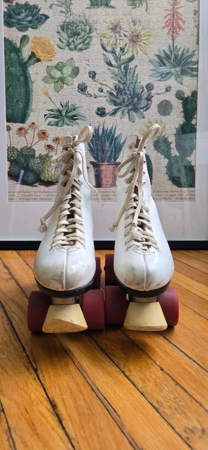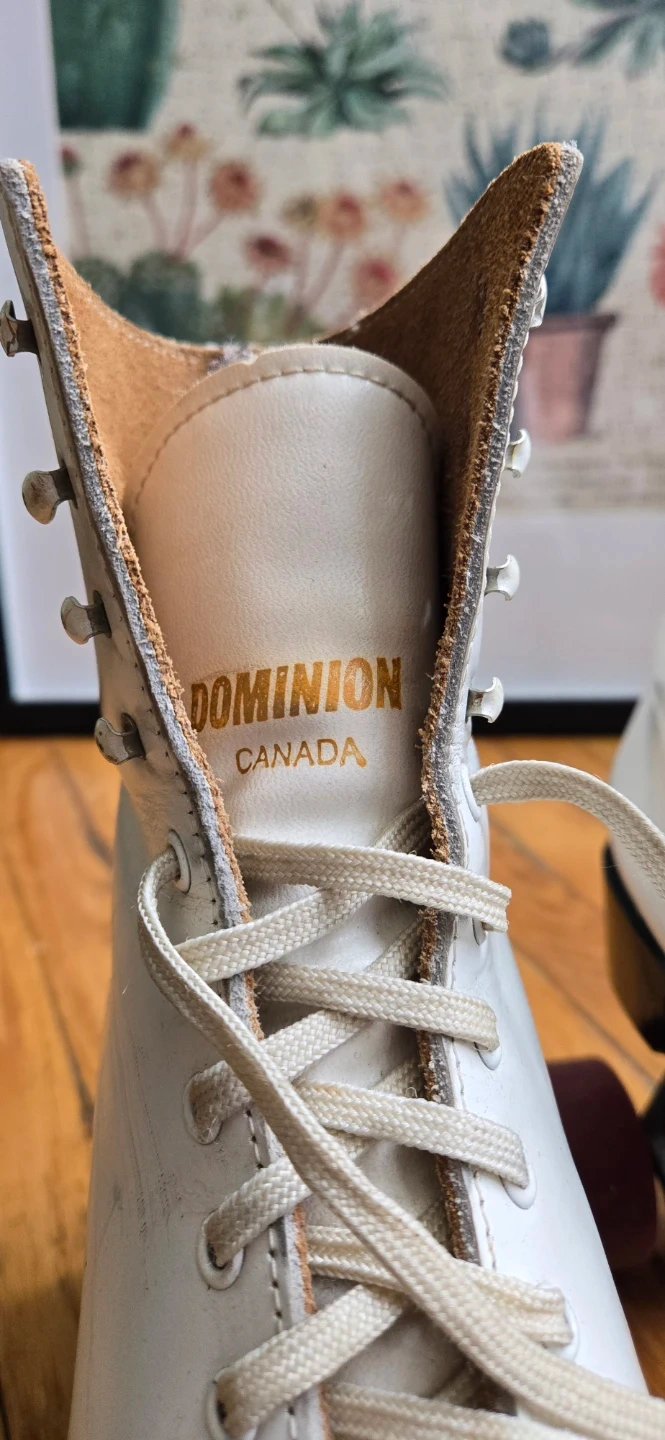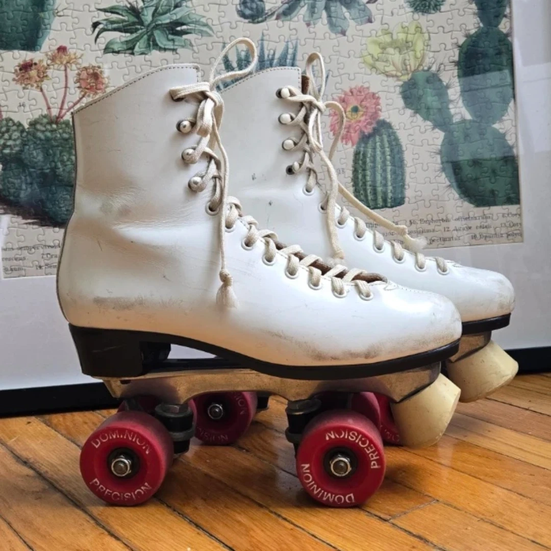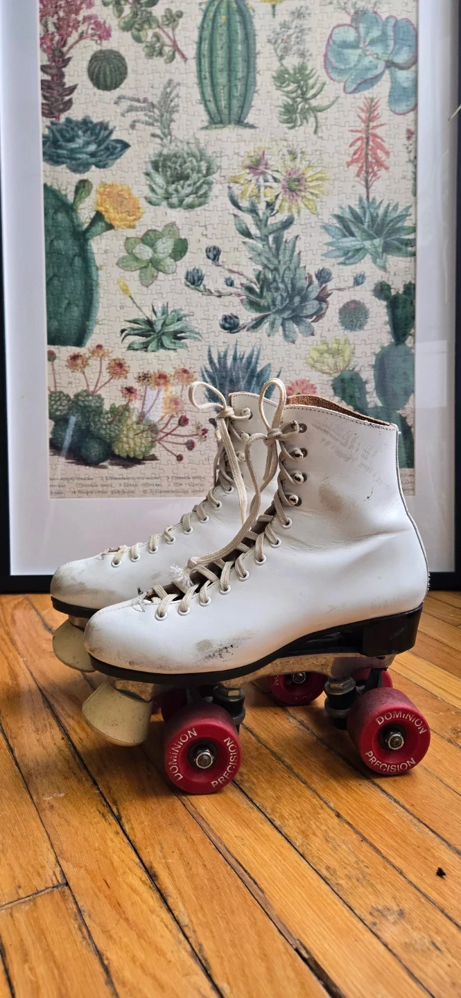 White leather Dominion Roller Skates with red wheels. Size is not marked but they fit like a size 7 women's. Some obvious wear and tear as these are old but they still work just as well!