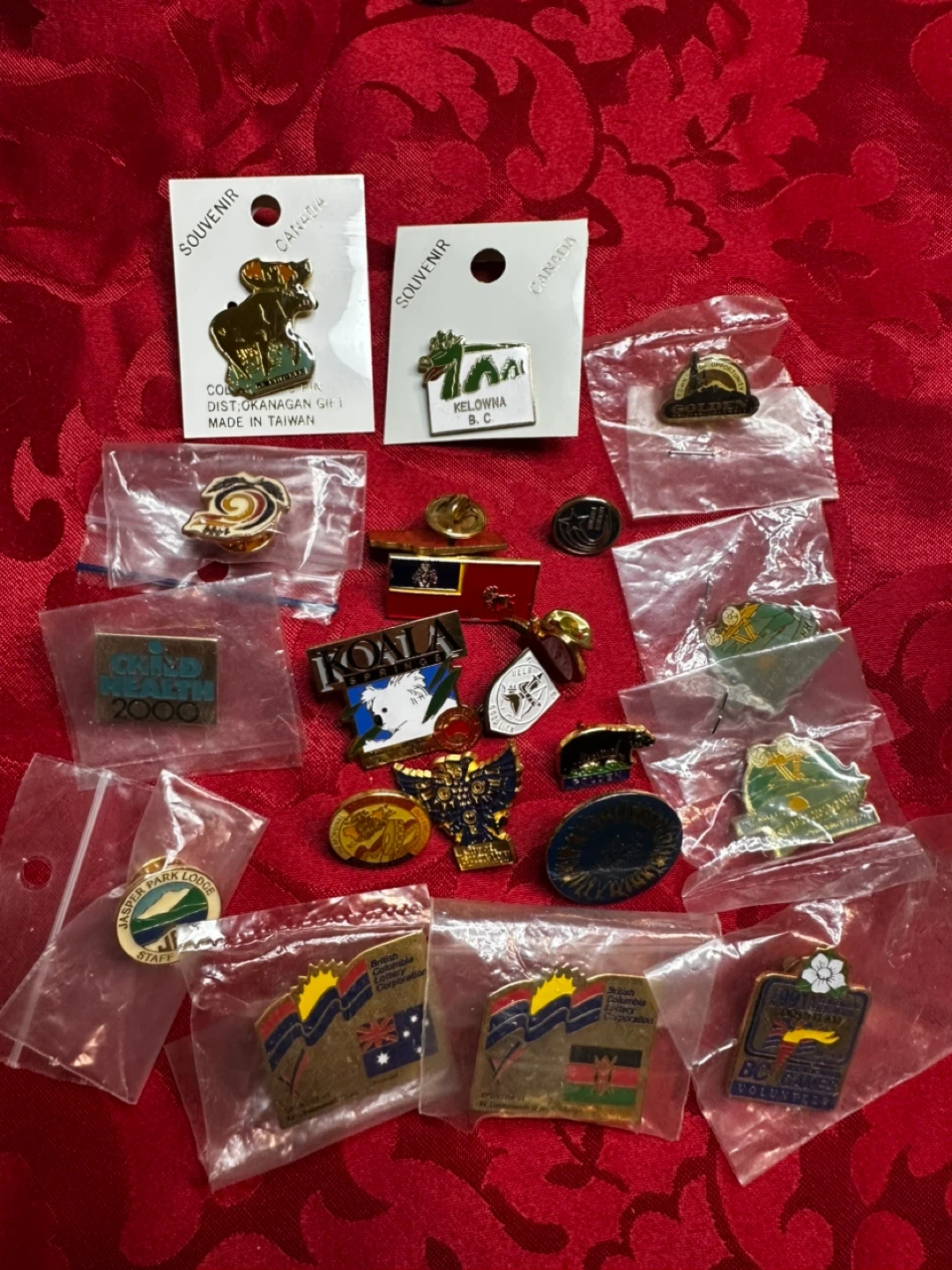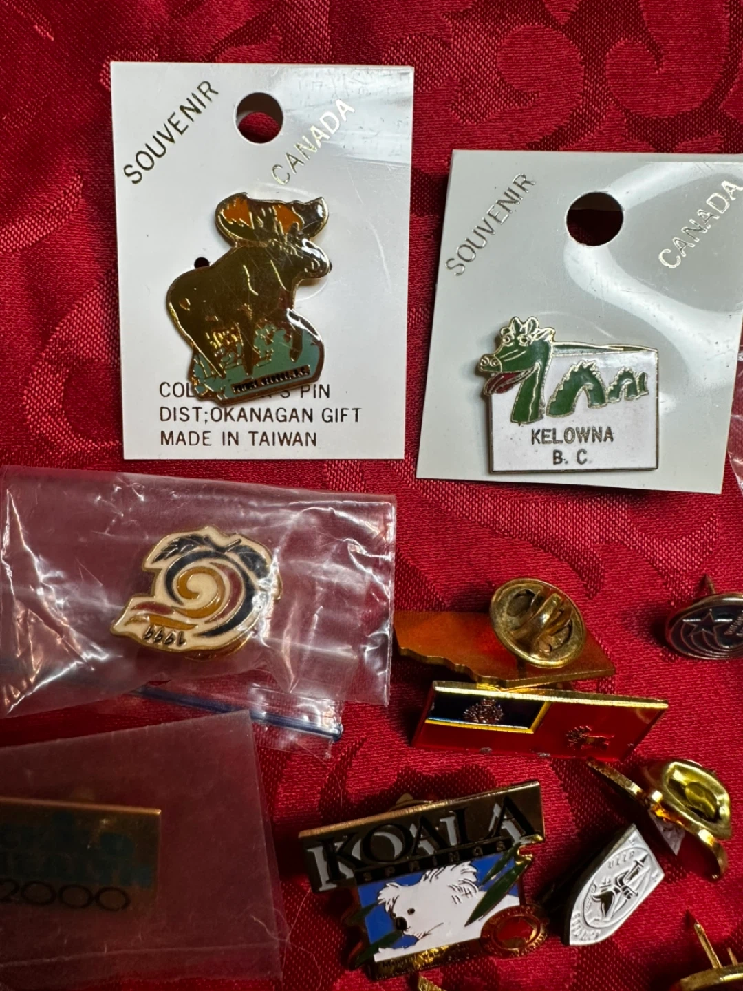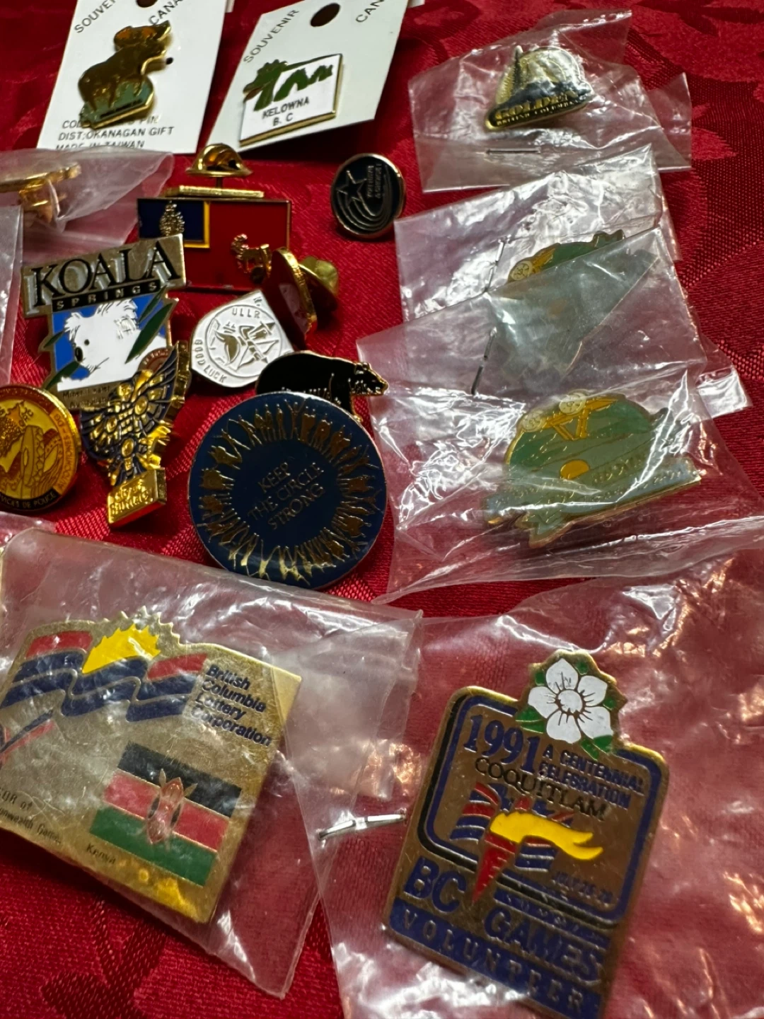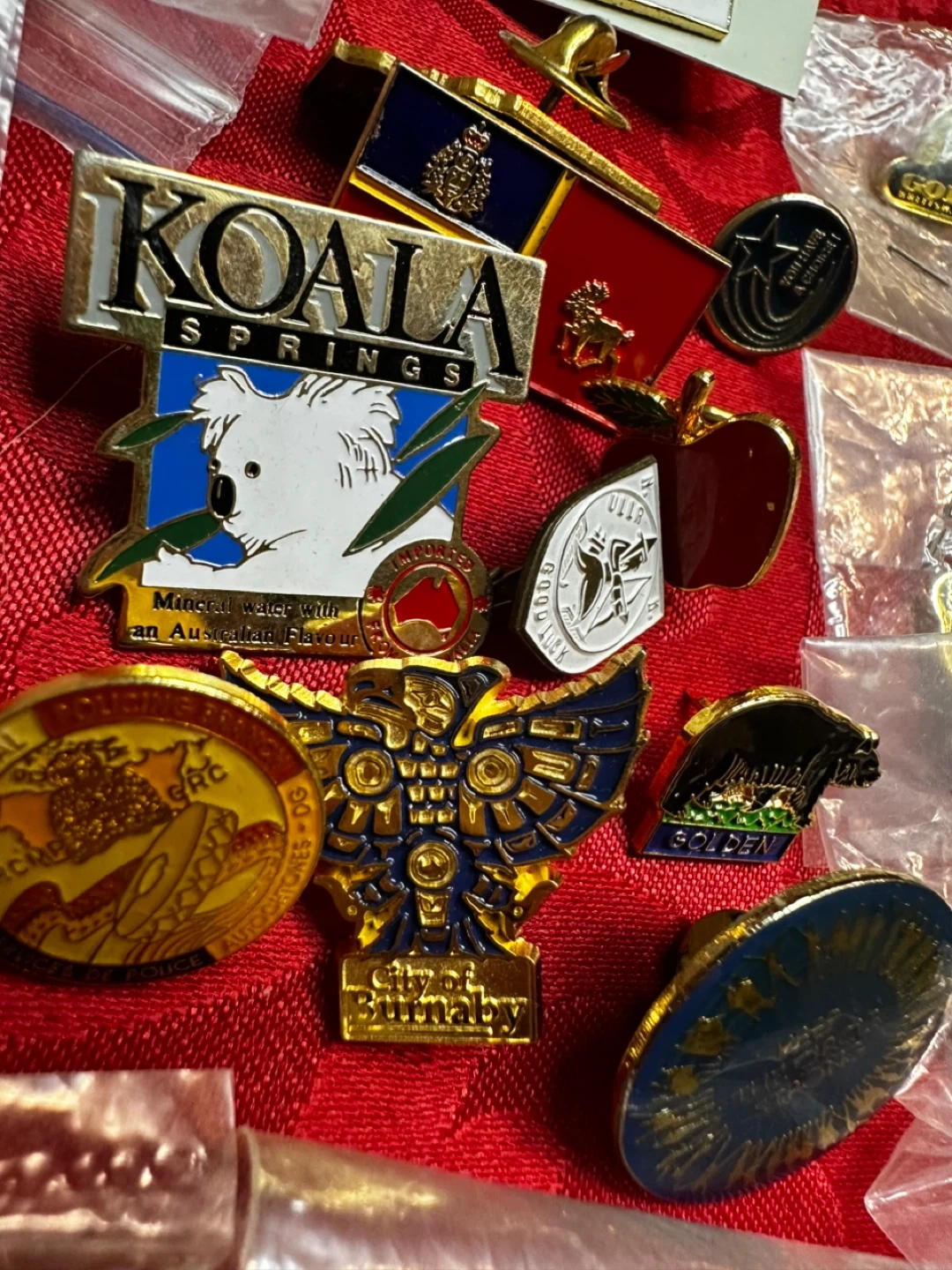 Assorted souvenir pins from various Canadian locations and events. Includes pins for British Columbia Lottery Corporation and BC Games volunteer. These pins are great for collectors or to commemorate a trip! Some knew some not.