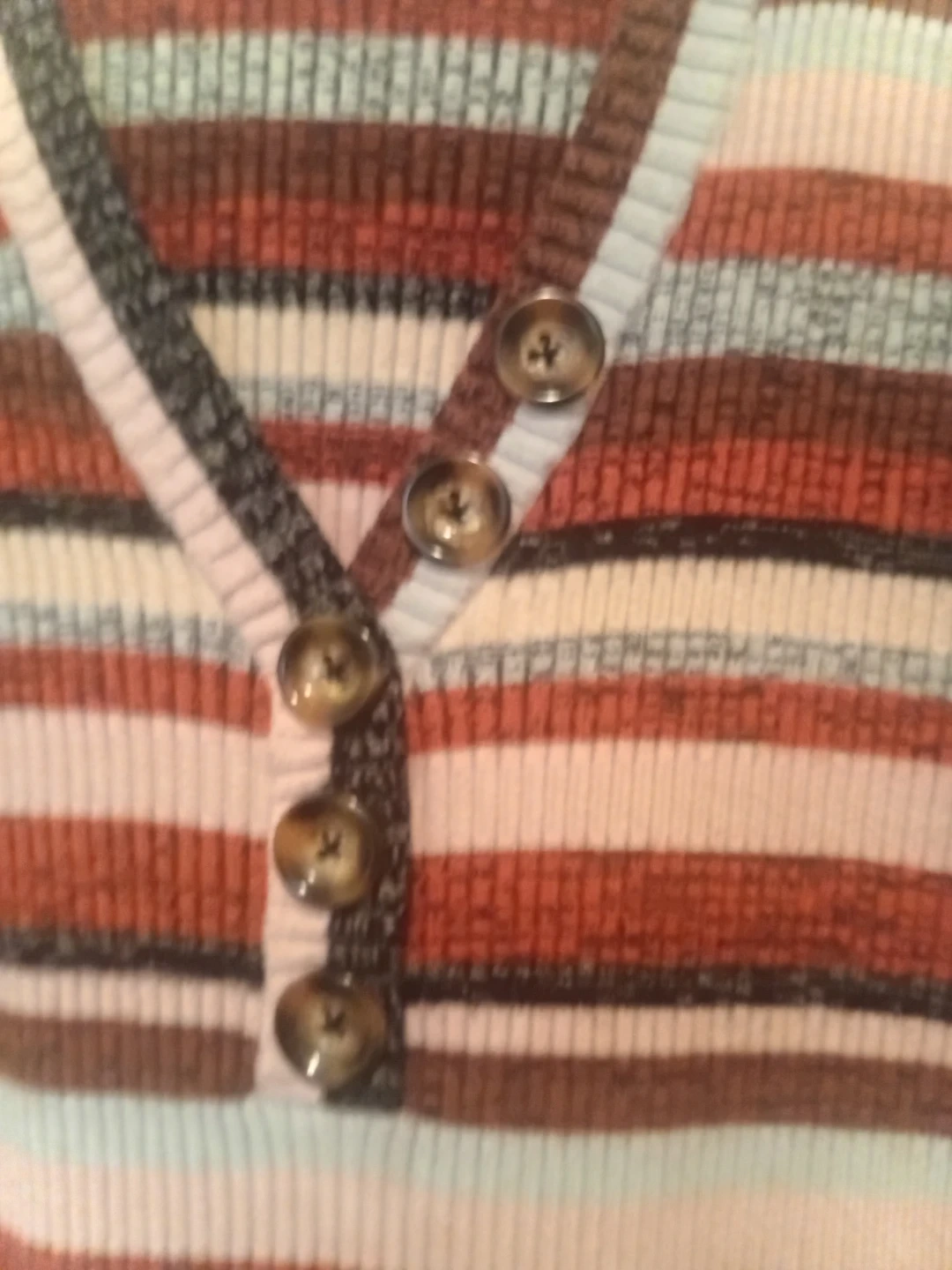 This is a Forever 21+ sweater dress with a v-neck and button details. It features a ribbed knit material in a multicoloured stripe pattern. The size is 3X.