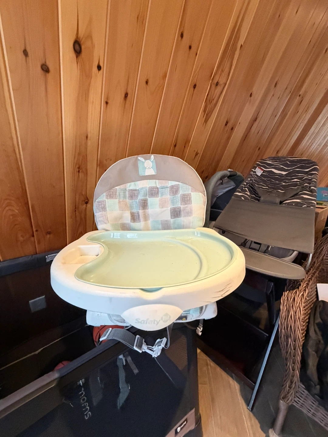 This is a Safety 1st high chair booster seat. It has a removable tray and a 3-point harness for safety. The seat pad is wipeable and features a cute bunny design. It's perfect for making meal times easier at home or on the go!