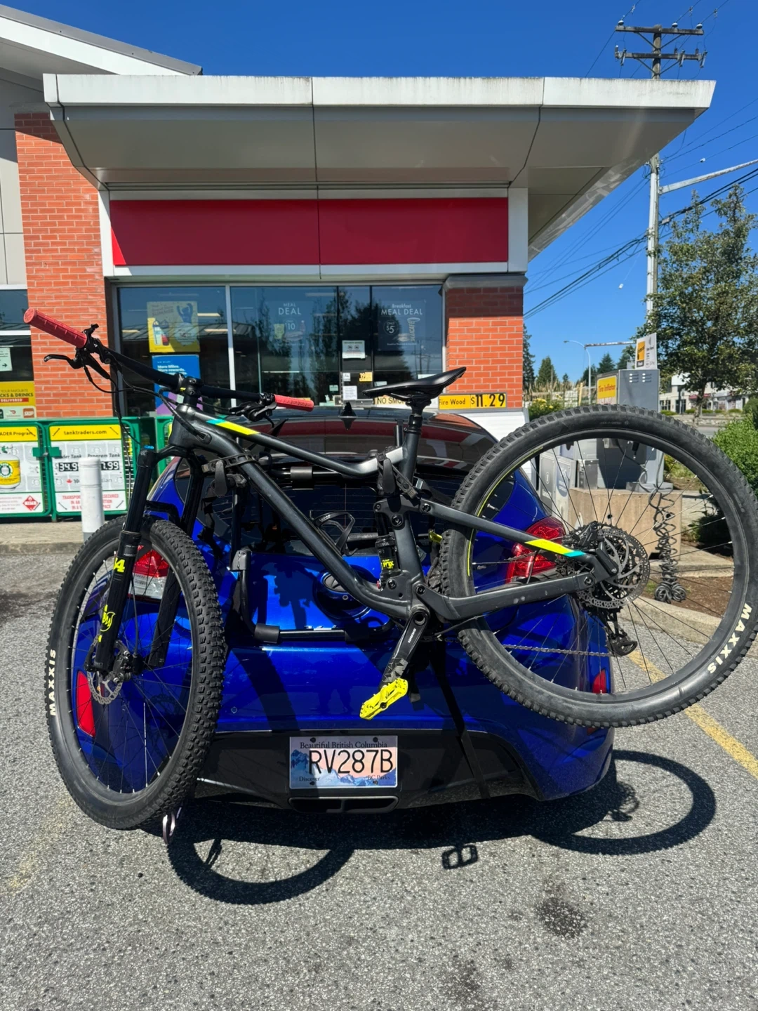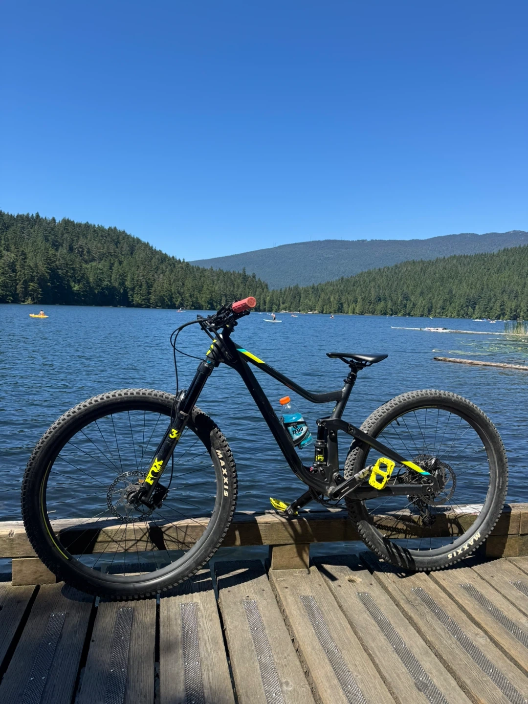 Full suspension mountain bike with a Fox Float DPS Elite rear shock. It has Maxxis tires and bright yellow pedal accents. This bike is ready for trails!