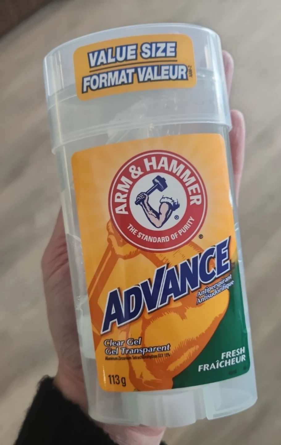 This is a value-size Arm & Hammer Advance Clear Gel antiperspirant. It's a "Fresh" scented gel with 19% Aluminum Zirconium Tetrachlorohydrex GLY. 113 grams total.