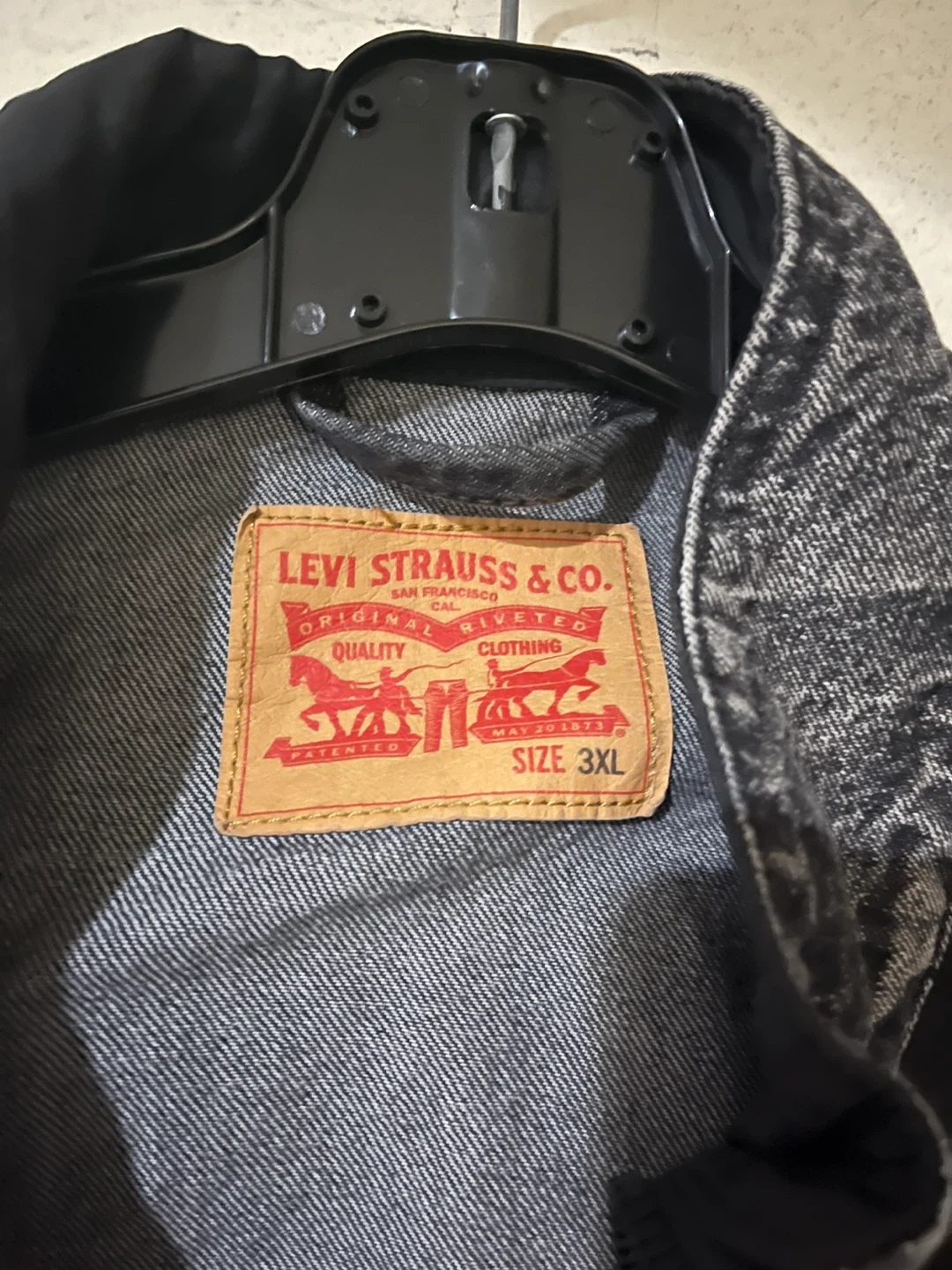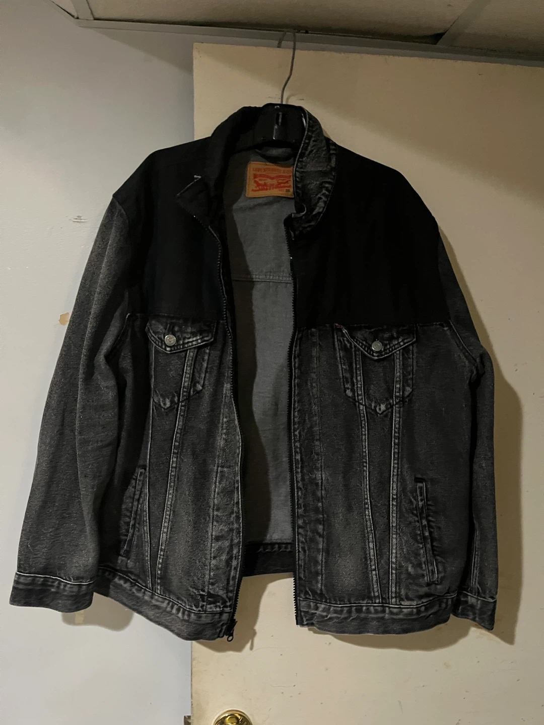 This is a Levi Strauss & Co. denim jacket. It's a size 3XL. The jacket is made of denim material with a contrasting black upper section.