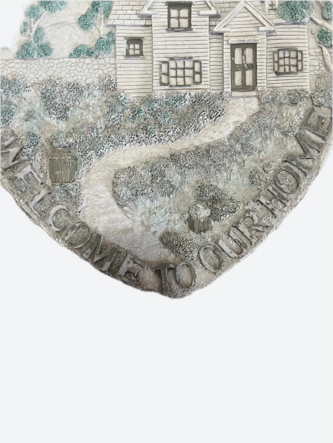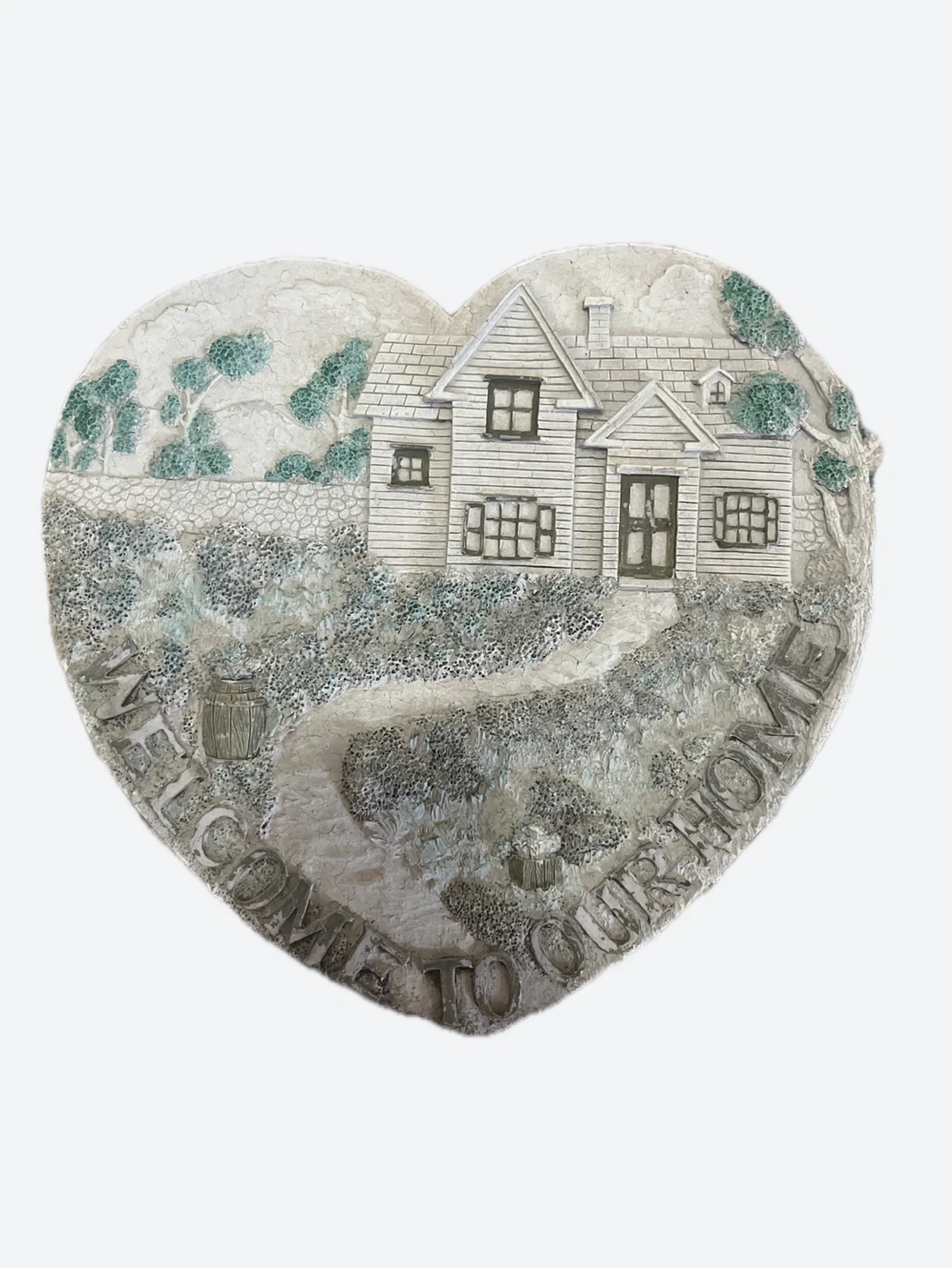 This heart-shaped garden plaque features a raised relief of a house with a winding path and trees. The words 'WELCOME TO OUR HOME' are embossed around the bottom edge. It's a lovely decorative piece for any garden or entryway. Made of durable material.