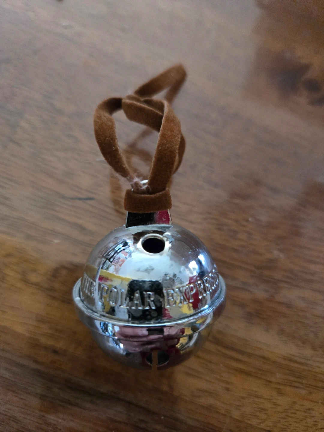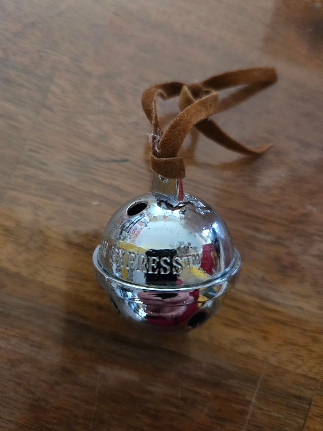 This is a shiny silver bell ornament with 'The Polar Express' inscribed on it. It has a brown cord for hanging. It's a classic holiday decoration!