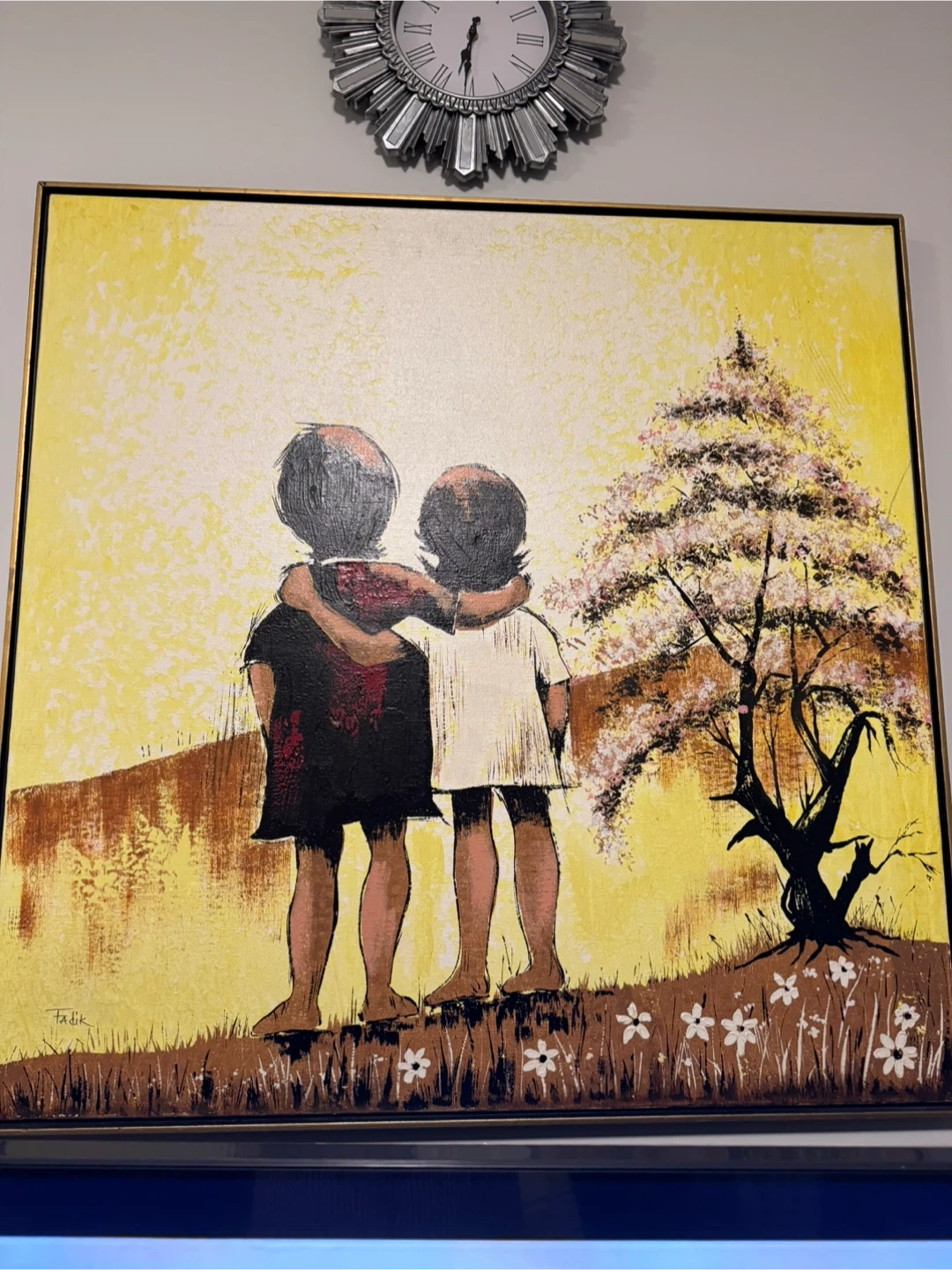 Framed painting by artist Fadik. It depicts two children with their arms around each other, standing in front of a tree. The artwork has a warm, yellow-toned background.