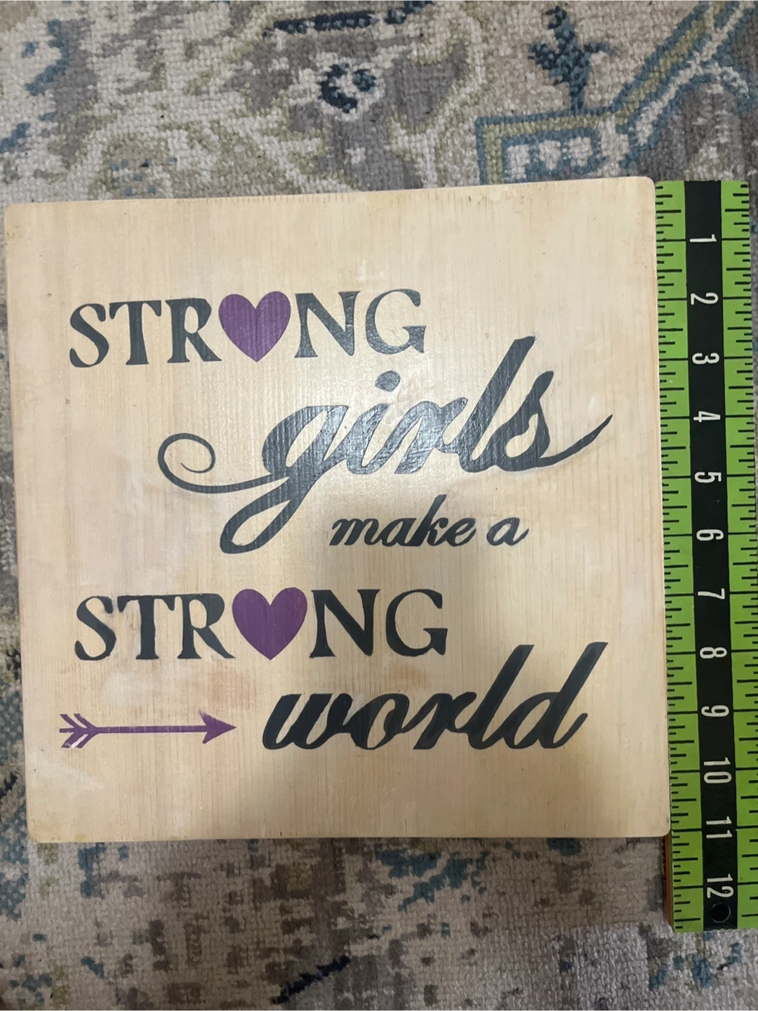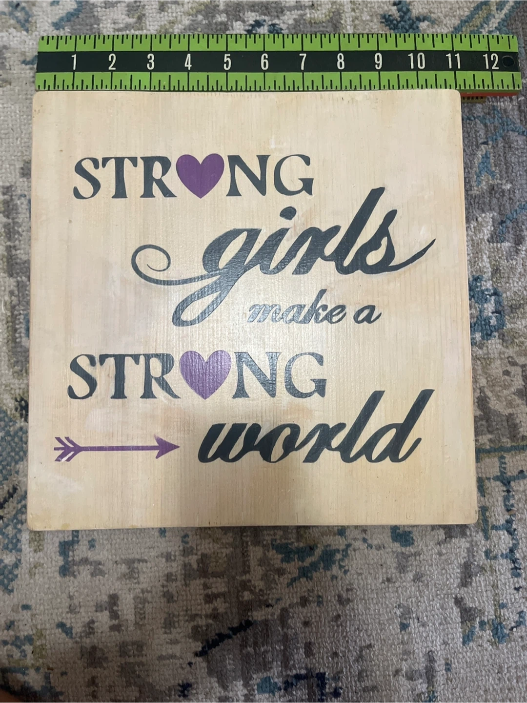 This is a wooden plaque with the inspirational quote "Strong girls make a strong world" printed on it. It features purple hearts and an arrow design. The sign is ready to hang with a string attached to the back.