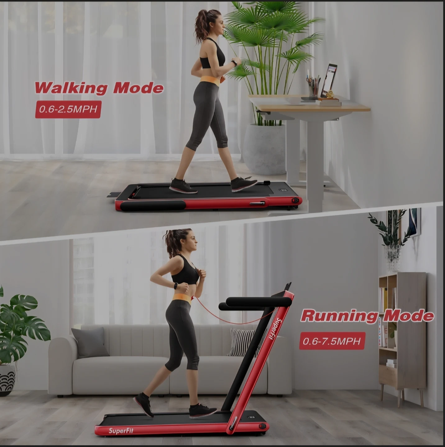 This quiet treadmill offers walking and running modes with speeds from 0.6-7.5MPH. It can be easily folded up and rolled under furniture when not in use to save space. The LED display shows time, speed, distance, and calories, and can be controlled via the control panel or remote control. It also has a Bluetooth speaker for music while exercising.