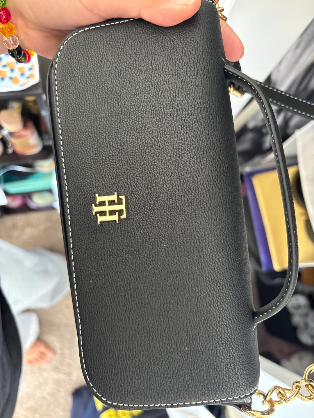 This is a black leather wallet from Tommy Hilfiger. It's a compact accessory for your essentials. It features the signature gold Tommy Hilfiger emblem.