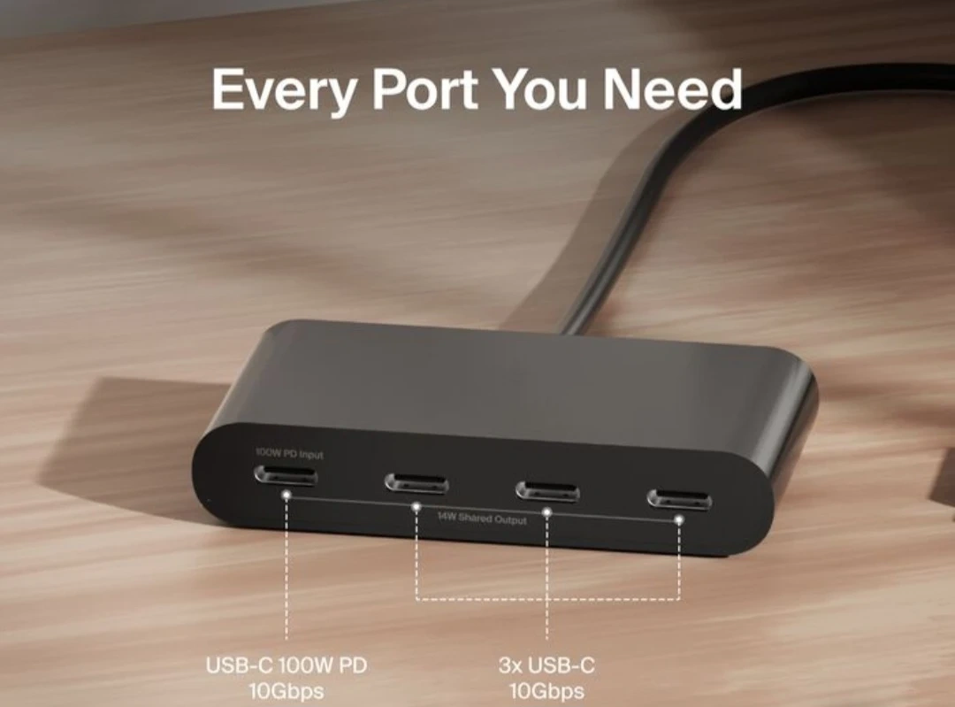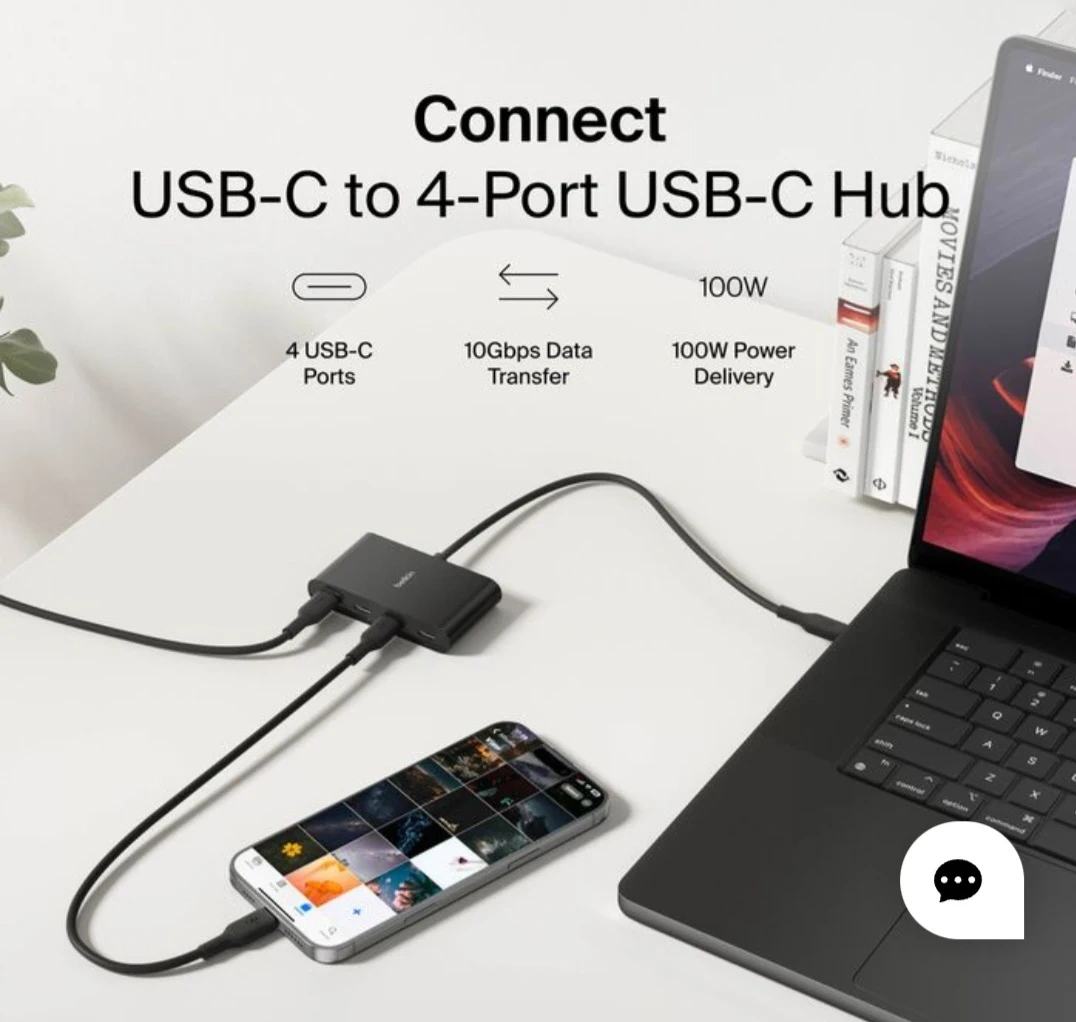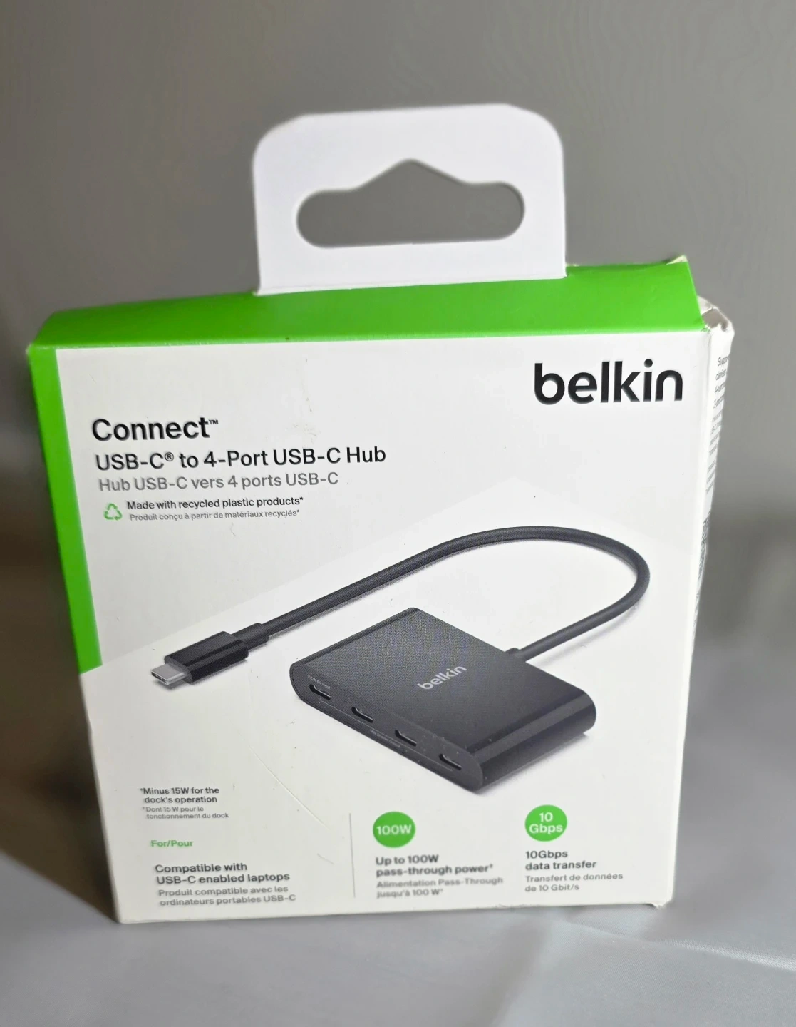 This Belkin Connect hub offers 4 USB-C ports. It supports 10Gbps data transfer speeds and up to 100W power delivery. Perfect for expanding your laptop's connectivity!