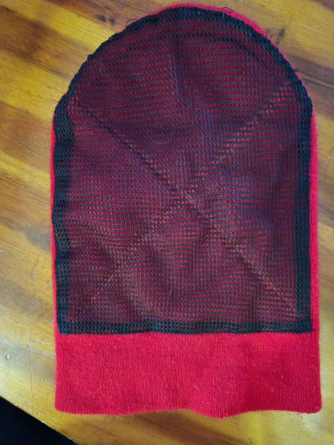 This is a knit beanie with a contrasting mesh panel on the front. It's made of soft, stretchy material for a comfortable fit. The vibrant blue and red colours make it stand out! This would be great for someone looking for a stylish and unique winter hat.