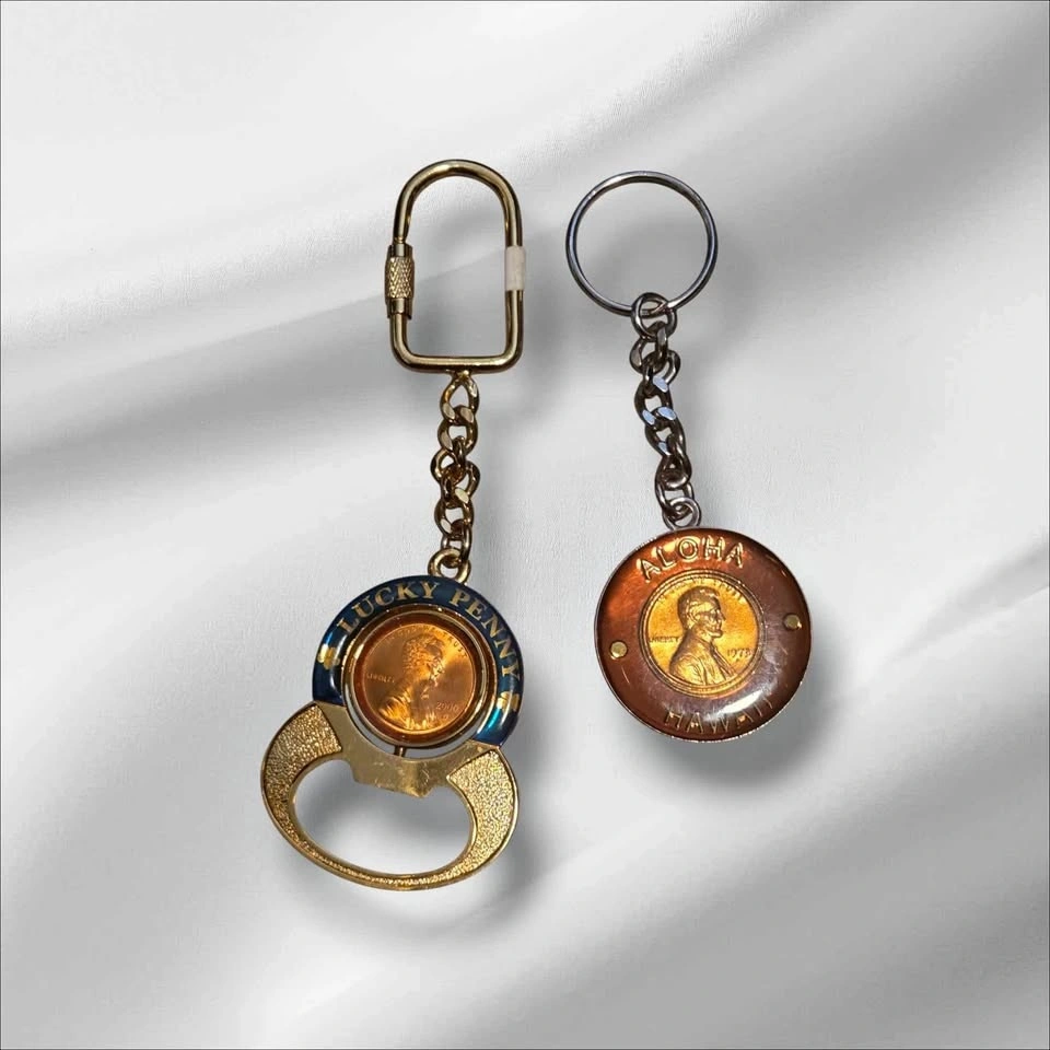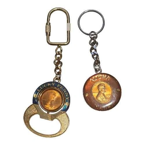Set of 2 vintage Hawaii souvenir keychains featuring encased Lincoln pennies. One reads “Aloha Hawaii”, the other “Lucky Penny” with a built-in bottle opener. Great retro travel souvenirs, collectible pieces, or fun everyday keychains. Good vintage condition. Pennies secure.