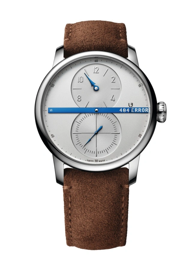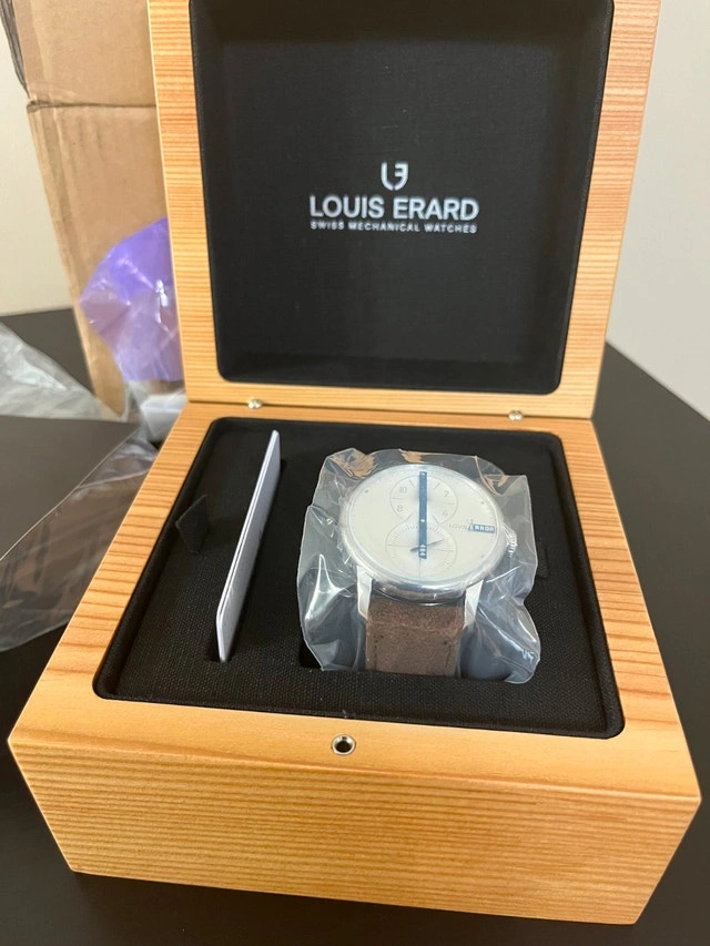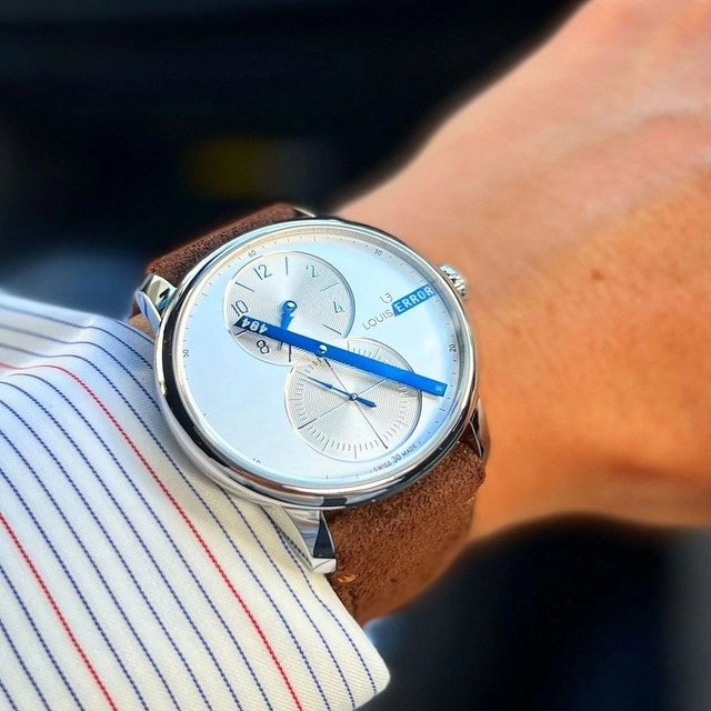 This is a GPHG (Oscars for watches) nominated, Swiss Movement watch, limited to only 178 pieces. It's a great watch to own or gift, with a fun Technology theme. All import duty/HST has been paid. BRAND: Louis Erard, MODEL: Le Régulateur x seconde/seconde, REFERENCE: 85237AA61. DIAL: Opaline (matt silver), snailed double counter with diamond-cut area, anthracite transfers, polished silver indices, polished blue plate at 3 o’clock, white signature "ERROR" transfer. CASE MATERIAL: Polished stainless steel with signature fir tree crown. CASE DIMENSIONS: 42 mm, lug width: 22 mm, lug to lug: 49.60 mm, thickness: 12.25 mm. CRYSTAL: Domed sapphire with anti-reflective treatment (top and caseback), knurled crown. MOVEMENT: Automatic regulator, Sellita SW266-1 calibre, 31 jewels, 28,800vph (4Hz), 38 hours power reserve, custom Louis Erard rotor. WATER RESISTANCE: Up to 5 bars (50 m/165 ft). STRAP: Chocolate calf nubuck leather with tone-on-tone stitching, polished stainless steel pin buckle, quick-release push pins. FUNCTIONS: Hour hand at 12, central minute hand, second hand at 6. CONDITION: New.