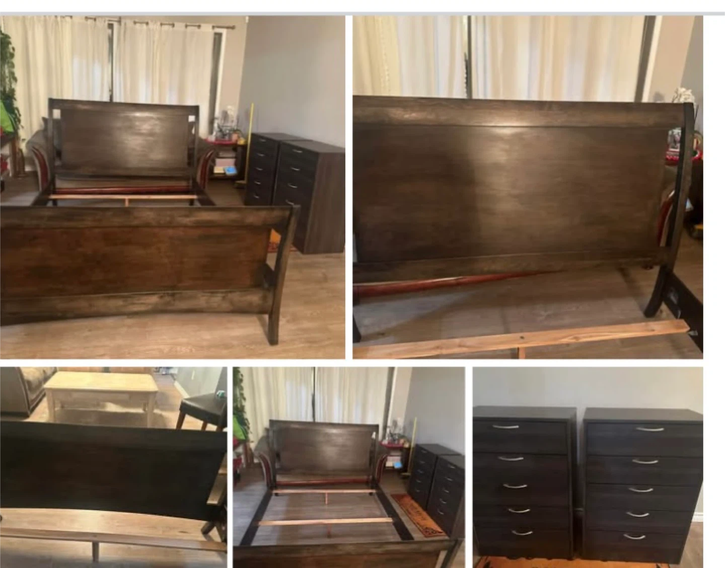 Solid wood sleigh bed frame in a dark brown finish. This bed frame has a classic design with a high headboard and footboard. It's sturdy and ready for a new home. Fits a queen mattress.