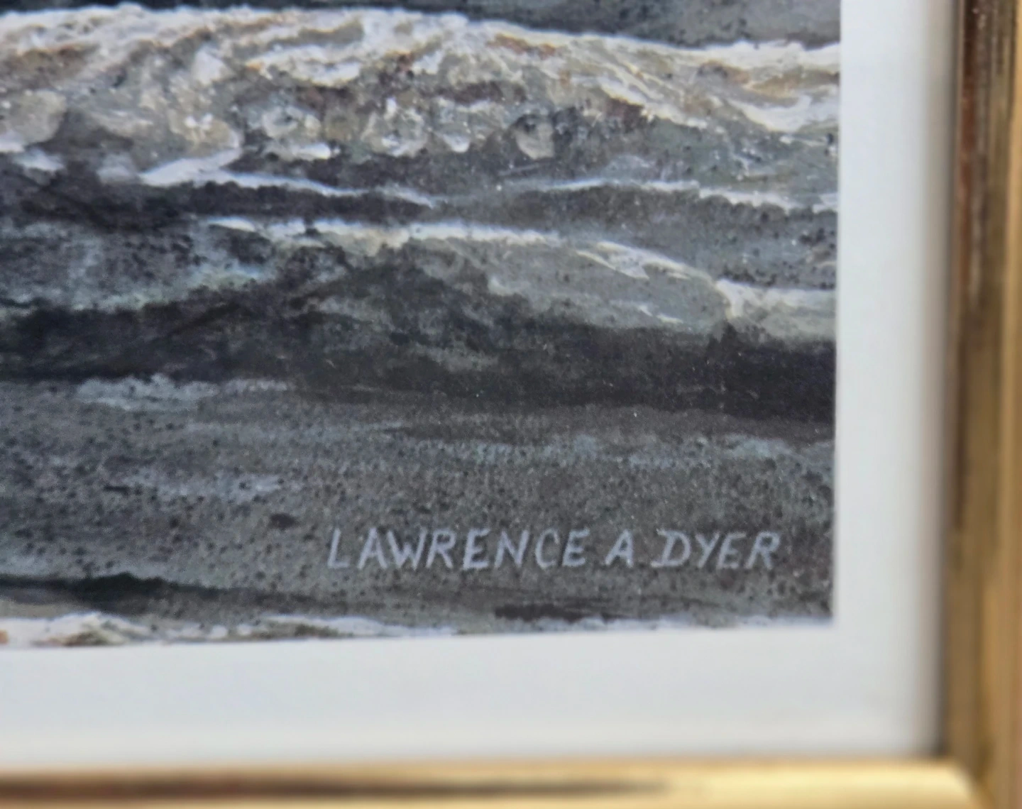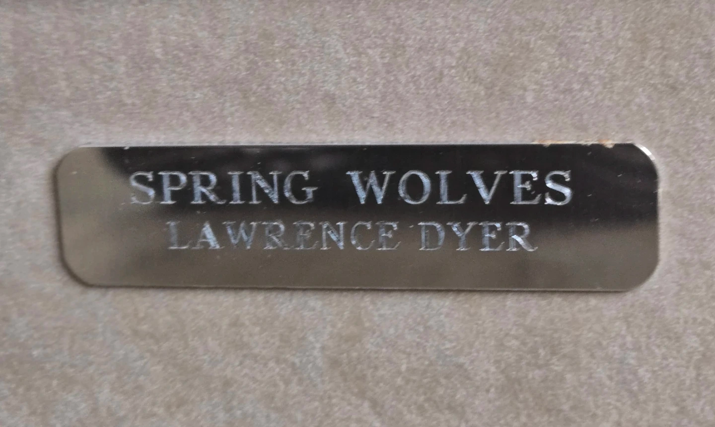 Beautifully Framed art print titled "Spring Wolves" by Lawrence A. Dyer 1989.The artwork depicts three wolves in a forest setting. Includes a plaque with the title and artist's name. It's a beautiful piece for any nature enthusiast's home.