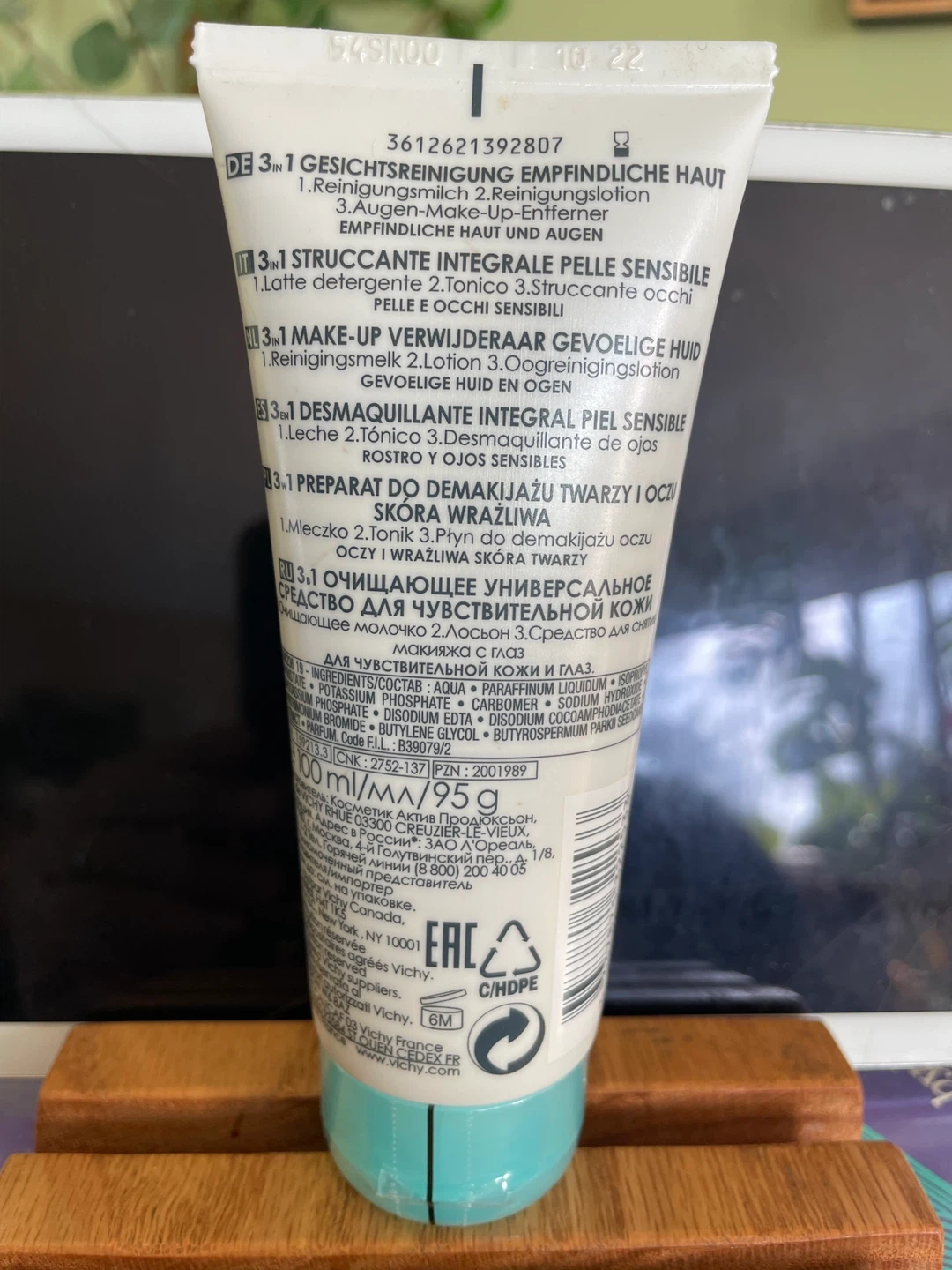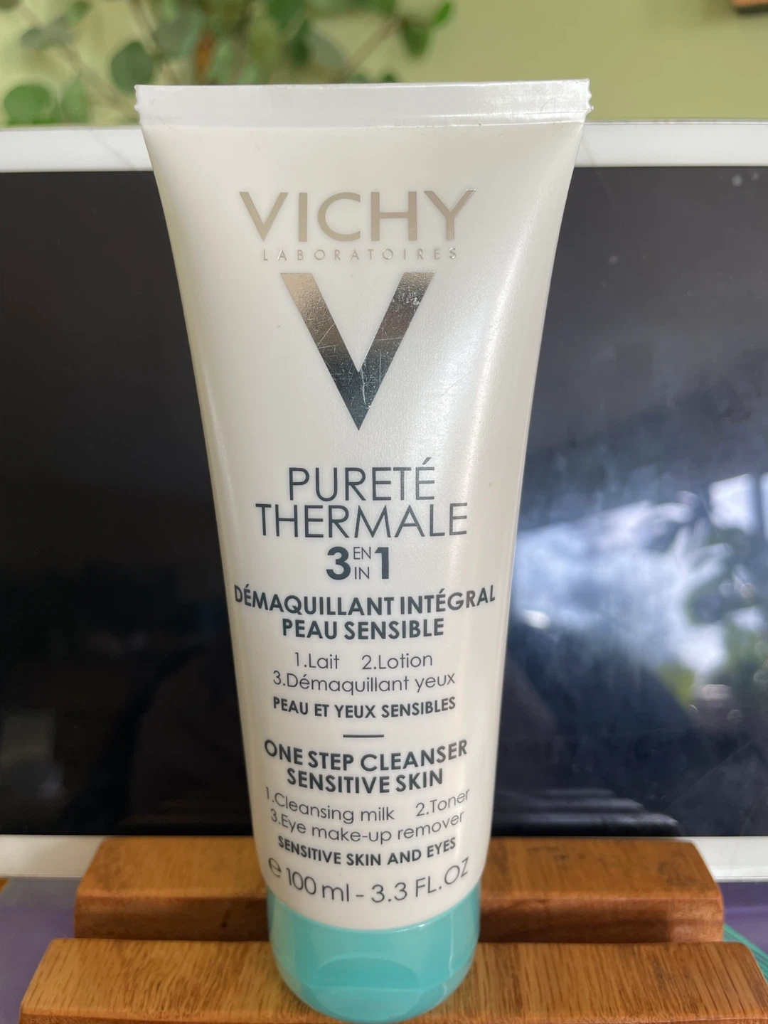 Vichy Pureté Thermale 3-in-1 cleanser for sensitive skin. It's a cleansing milk, toner, and eye make-up remover in one. 100 ml size.