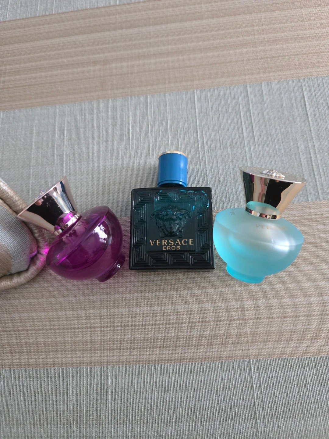 Three miniature perfume bottles from Versace. Includes Versace Eros Eau de Toilette and two other Versace fragrances. Perfect for travel or sampling different scents!